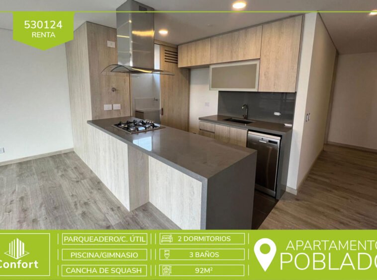 53-01-24 Hermoso y moderno apartamento disponible para la renta , ubicado en exclusivo sector del Poblado, como lo es Altos del Poblado, cuenta con un área de 92mt2 distribuidos en sala comedor, balcón, 2 habitaciones con baño privado y vestier, adicional 1 baño social, biblioteca y zona de ropas, apartamento de diseño muy moderno y fresco, incluye parqueadero y cuarto útil, está ubicado en unidad cerrada con vigilancia 24/7, con zonas comunes como piscinas, gimnasio, cancha de squash, salón social, zonas verdes. A su alrededor podemos encontrar edificio Intercontinental, restaurante Hato Viejo, con vías de Acceso por avenida las Palmas y Transversal inferior y superior. CONFORT INMOBILIARIA