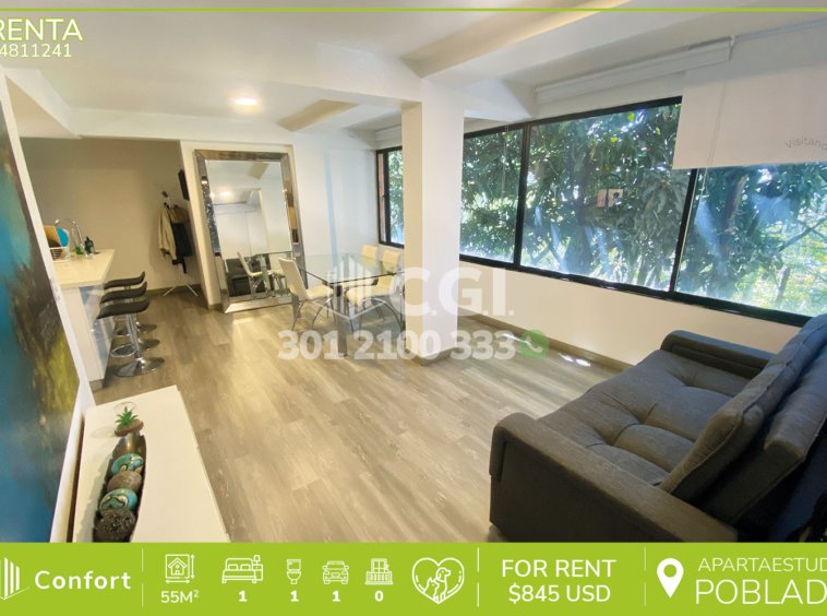 48-11-241 Inmobiliaria en Medellín arrienda apartaestudio ubicado en el sector de Altos del Poblado, cuenta con 55mt2 distribuidos en sala comedor, cocina semi integral con barra americana, habitación con su respectivo vestier, baño privado y parqueadero. Ubicado en edificio con seguridad privada 12/7 y zonas verdes, a su alrededor podemos encontrar museo Pablo Escobar, Ámsterdam plaza y la universidad CES, con rutas de acceso por transversal superior, calle 10 y gran variedad de transporte público. CONFORT GESTORES INMOBILIARIOS – Arriendo en El Poblado