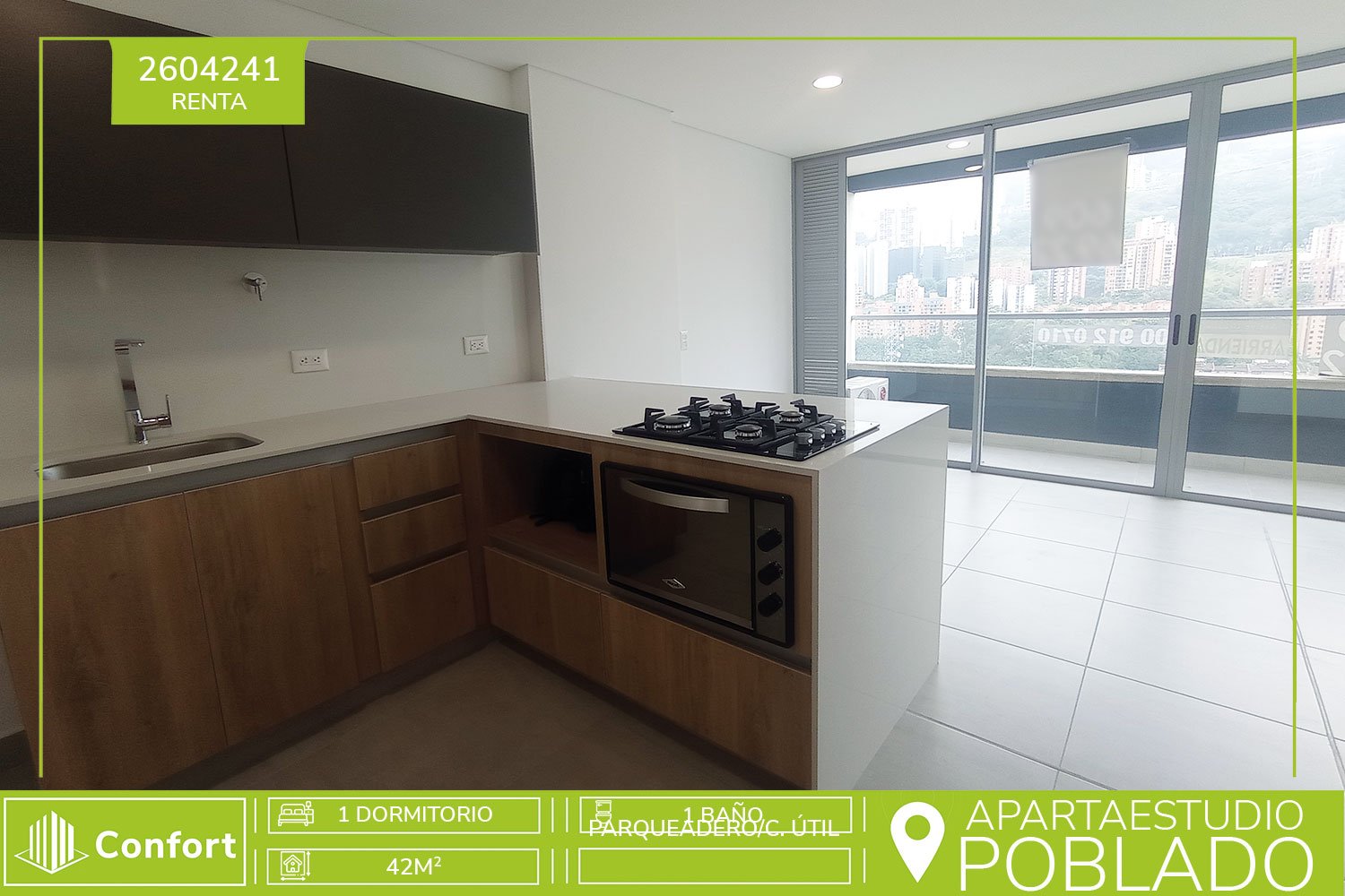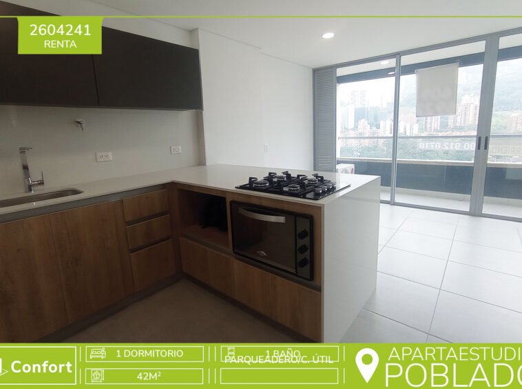 26-04-241 Hermoso Apartaestudio disponible para la renta en el sector de Ciudad del Río en el Poblado. Cuenta con un área aproximada de 42 mt2 distribuidos en espacio para sala y habitación con aire acondicionado, cocina semi integral con horno, 1 baño social y 1 baño privado, zona de ropas espaciosa, balcón con vista panorámica, cuarto útil y parqueadero privado. Ubicado en un sector muy tranquilo, en unidad residencial con seguridad 24/7 y áreas comunes como zona social, parque infantil, piscina de niños y de adultos, sala de reuniones, sala de estar, zona de lectura, sala de juegos, sala de fiestas, sauna y turco. A su alrededor podemos encontrar Museo de Arte Moderno de Medellín, Comfama Ciudad del Río, Clínica del Prado, parque lineal Ciudad del Río. Con rutas de acceso por avenida las Vegas, avenida Regional, avenida el Poblado y diferentes rutas de transporte público. CONFORT INMOBILIARIA