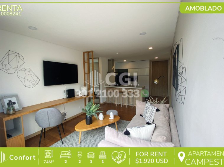 100-08-241 Inmobiliaria en Medellín arrienda hermoso apartamento amoblado ubicado en el exclusivo sector del Campestre en el Poblado. Cuenta con un área de 74mt2 distribuidos en sala comedor, balcón, cocina integral con full iluminación y barra americana, zona de ropas, 2 habitaciones, ambas con vestier y la principal de ellas con baño privado, adicional 1 baño social y parqueadero. Se encuentra ubicado en unida residencial con seguridad 24/7, además cuenta con zonas comunes como turco, salón social, salón de masajes y gimnasio, a su alrededor podemos encontrar Centro Comercial Santa Fe, Rosa Mística, Club Campestre, con vías de acceso por avenida el Poblado, avenida las Vegas y gran variedad de transporte público. CONFORT GESTORES INMOBILIARIOS – Arriendo en el Poblado