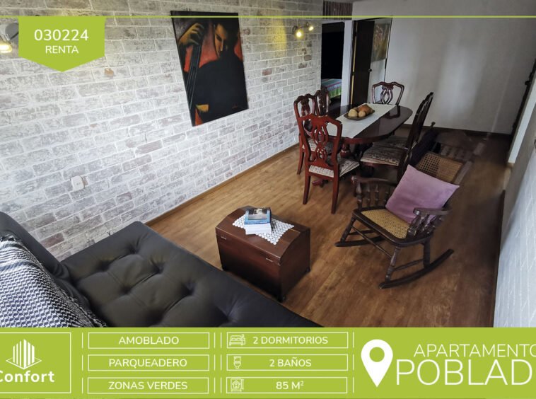 03-02-24 Hermoso apartamento amoblado disponible para la renta en El Poblado, cuenta con un area de 85mt2 distribuidos en 2 habitaciones, biblioteca/estudio, todas con acceso a balcones, cocina integral, sala comedor, 2 baños y 1 parqueadero, la unidad residencial cuenta con portería 24/7, parqueadero de visitantes y zonas verdes. A su alrededor podemos encontrar Centro Comercial El Tesoro, D1 Loma Los Parra y Transversal Inferior. CONFORT INMOBILIARIA