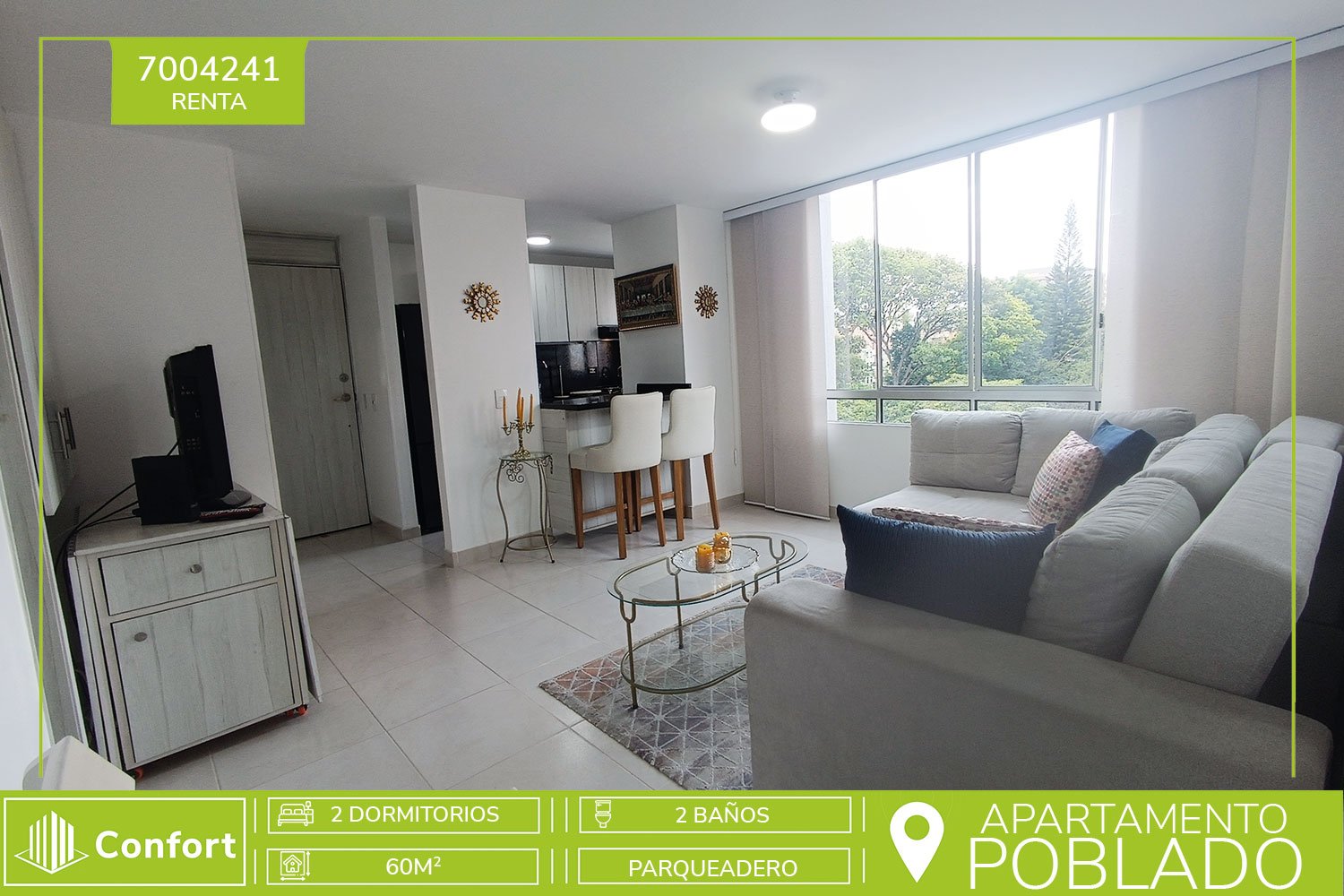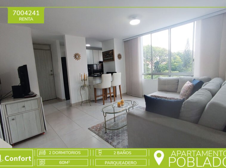 70-04-241 Acogedor apartamento amoblado disponible para la renta ubicado en el sector de Manila en el Poblado, cuenta con un área de 60mt2 distribuidos en sala a comer, cocina integral moderna, 2 habitaciones de excelente tamaño con closet, la habitación principal cuenta con baño privado moderno, adicional 1 baño social, este hermoso apartamento esta totalmente equipado para tu estancia. Incluye parqueadero. Ubicado en unidad con seguridad 24/7 con zonas de esparcimiento como piscina, salón social, gimnasio, zona pet y parque infantil. A su alrededor podemos encontrar Telemedicina, Pinar del río, y Cámara Colombiana de la Infraestructura, con rutas de acceso por Avenida el Poblado y carrera 43F, variedad de transporte público. CONFORT INMOBILIARIA