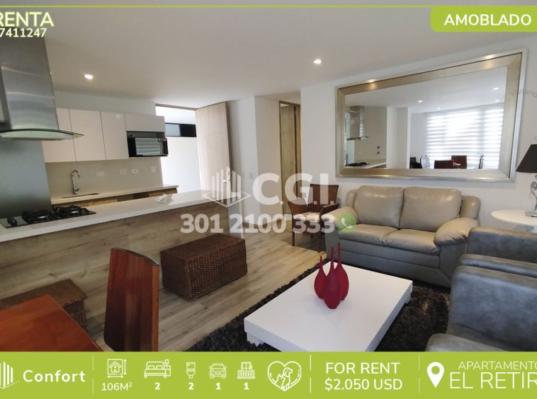 77-11-247 Apartamento disponible para la renta ubicado en el sector de El Retiro – Antioquia, cuenta con un área de 106 mts2 distribuidos en sala comedor, cocina integral, balcón, zona de ropas integrada con lavadora y secadora, 2 habitaciones, una de ella cuenta con vestier y baño privado, la otra con closet, baño social y parqueadero. Ubicado en unidad cerrada que cuenta con seguridad privada 24/7 y zonas comunes tales como ascensor, zona de masaje, sauna, turco, gimnasio, salón social, juegos infantiles, zona co-working y zonas verdes, a su alrededor podemos encontrar mall Macedonia, con vías de acceso por Medellín – El Retiro, Rionegro – El Retiro y gran variedad de rutas de transporte público. CONFORT GESTORES INMOBILIARIOS – Arriendo El Retiro
