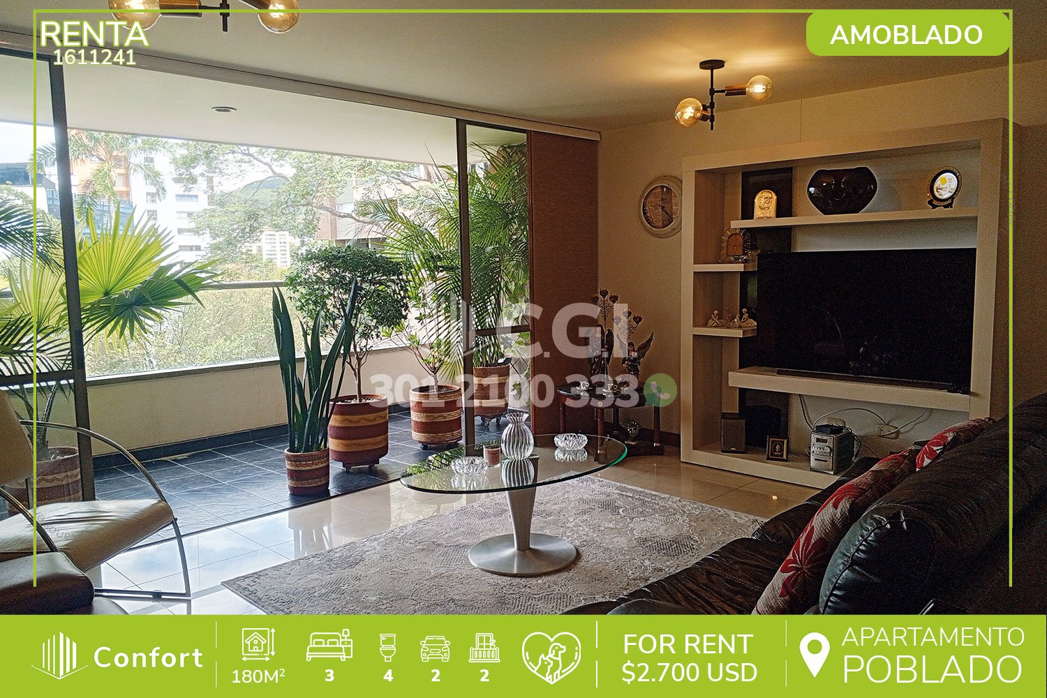16-11-241 Inmobiliaria en Medellín arrienda apartamento amoblado ubicado en tranquilo sector de Las Santas en El Poblado, cuenta con un área de 180mt2 distribuidos en sala comedor de muy buen espacio, cocina integral con barra americana, zona de ropas, 2 balcones, sala de estudio, 3 habitaciones con baño privado y una de ellas con vestier, baño social y 2 parqueaderos. Ubicado en unidad con seguridad 24/7 y con zonas comunes como piscina para niños y adultos, salón social, parque infantil, turco y gimnasio, a su alrededor podemos encontrar el centro comercial El Tesoro, museo Pablo Escobar y el colegio Marymount, con rutas de acceso por las avenidas El Poblado, Las Palmas, tranversal superior y gran variedad de rutas de transporte público. CONFORT GESTORES INMOBILIARIOS – Arriendo en El Poblado