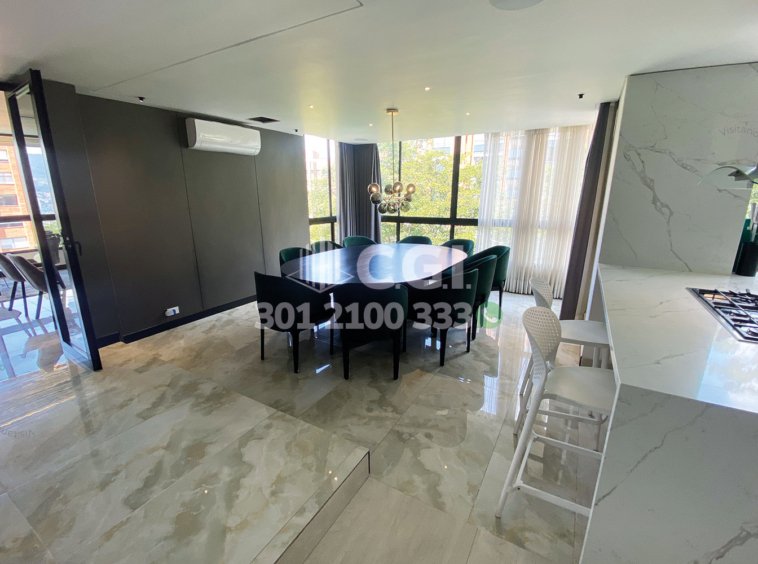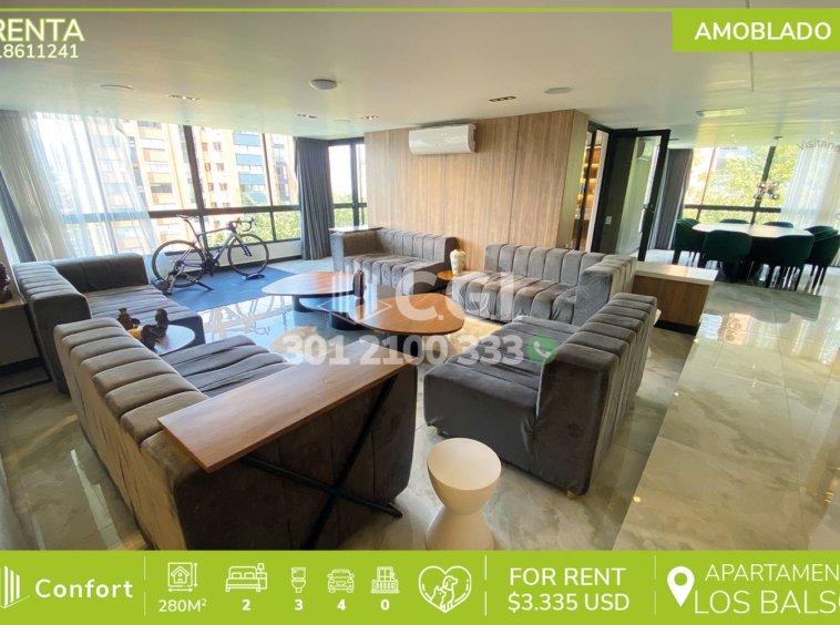 193-11-241 Inmobiliaria en Medellín arrienda apartamento amoblado ubicado en el sector de Los Balsos en El Poblado, cuenta con un área de 280mt2 distribuidos en sala de muy buen espacio, comedor, cocina integral con barra americana y hermosos acabados, zona de ropas, 2 habitaciones cada una con su respectivo baño privado y vestier, una de ellas con bañera, baño social, sala de star, habitación de servicio con su respectivo baño privado, 4 parqueaderos y cuarto útil. Ubicado en unidad con seguridad privada 24/7 y zonas comunes como piscina para niños y adultos, salón social, turco, parque infantil y zonas verdes, a su alrededor podemos encontrar PriceSmart, Vermont School y supermercado La Vaquita, con rutas de acceso por la transversal inferior, avenida El Poblado y gran variedad de transporte público. CONFORT GESTORES INMOBILIARIOS – Arriendo en El Poblado