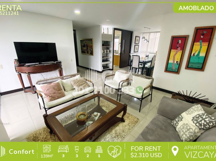 52-11-241 Inmobiliaria en Medellín arrienda apartamento amoblado ubicado en el sector de Vizcaya en El Poblado, cuenta con un área de 139mt2 distribuidos en sala comedor, cocina integral, zona de ropas, balcón, sala de estudio, 3 habitaciones, una de ellas con baño privado y vestier, 2 con clóset, 2 baños sociales, habitación de servicio con su respectivo baño privado, 2 parqueaderos y cuarto útil. Ubicado en unidad cerrada con seguridad privada 24/7 y zonas comunes como piscina para niños y adultos, salón social, gimnasio, parque infantil y zonas verdes, a su alrededor podemos encontrar Mall Verona, Carulla y el centro comercial Vizcaya, con rutas de acceso por la transversal inferior, calle 10 y gran variedad de rutas de transporte público. CONFORT GESTORES INMOBILIARIOS – Arriendo en El Poblado