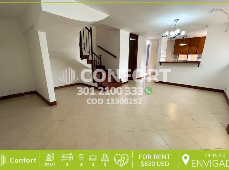 133-08-252 Inmobiliaria en Medellín arrienda apartamento dúplex ubicado en el sector de La Loma del Escobero en Envigado, cuenta con un área de 83mt2 distribuidos en sala comedor, cocina semi integral con barra americana, zona de ropas, terraza, baño social, 2 habitaciones cada una con baño privado y clóset, una de ellas con balcón, sala de estudio, parqueadero y cuarto útil. Ubicado en edificio con seguridad privada 24/7 y zonas comunes como piscina de adultos y niños, sauna, turco, parque infantil gimnasio, salón social, cancha de squash, placa polideportiva, mini golf, ping pong, BBQ, zona de mascotas y zonas verdes, a su alrededor podemos encontrar el centro comercial City Plaza y Euro Supermercados, con vías de acceso por la transversal intermedia y gran variedad de rutas de transporte público. CONFORT GESTORES INMOBILIARIOS – Arriendo en Envigado