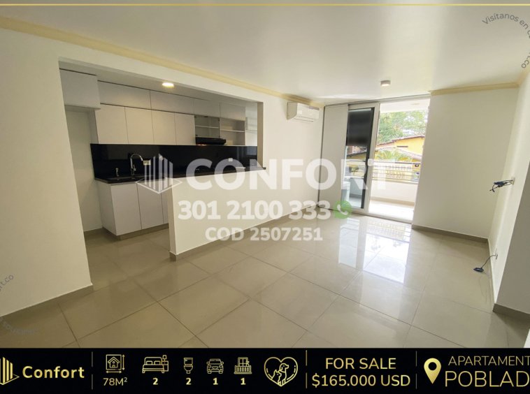 25-07-251 Inmobiliaria en Medellín vende apartamento en el sector de Alejandría en el Poblado. Cuenta con un área de 78mt2 distribuidos en cocina totalmente reformada, sala comedor con aire acondicionado, balcón, 2 habitaciones, la principal con vestier y baño privado, 1 baño social, 1 parqueadero y cuarto útil. Ubicado en unidad con seguridad privada 24/7 y con zonas comunes como zonas verdes, parque infantil y parqueadero de visitantes. A su alrededor encontramos mall la Strada, centro empresarial San Fernando, mall Zona Dos, con vías de acceso por avenida el Poblado y la transversal Inferior. CONFORT GESTORES INMOBILIARIOS – Venta en el Poblado