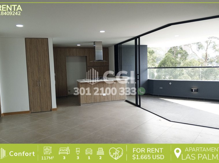 184-09-241 Inmobiliaria en Medellín arrienda hermoso apartamento ubicado en tranquilo sector de Alto de Palmas en El Poblado, cuenta con 117mt2 distribuidos en sala comedor de muy buen espacio, cocina integral, con barra americana, 2 balcones con vista panorámica, zona de ropas, 3 habitaciones, 2 de ellas con baño privado, una con clóset y la otra con vestier, baño social y parqueadero. Ubicado en unidad con seguridad 24/7 y con zonas comunes como piscina para niños y adultos, salón social, parque infantil, piscina, sauna, turco, salón social, gimnasio, jacuzzi en el último piso y zonas verdes, a su alrededor podemos encontrar el centro comercial San Diego, mirador de Las Palmas y túnel de Oriente, con rutas de acceso por las avenidas Las Palmas, El Poblado y gran variedad de rutas de transporte público. CONFORT GESTORES INMOBILIARIOS – Arriendo en El Poblado