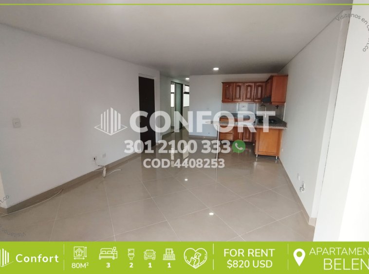 44-08-253 Inmobiliaria en Medellín arrienda apartamento ubicado en el sector de Belén la Palma. Cuenta con un área de 80mt2 distribuidos en sala comedor, cocina semi integral, zona de ropas, balcón, 3 habitaciones, la principal de ellas con baño privado, además 1 baño social, parqueadero y cuarto útil. Se encuentra ubicado en tranquilo sector, a su alrededor podemos encontrar centro comercial los Molinos, bomba de gasolina la Palma, Éxito de Belén, y con vías de acceso por la avenida 80 y Avenida la 30, y gran variedad de rutas de transporte público. CONFORT GESTORES INMOBILIARIOS – Arriendo en Medellín