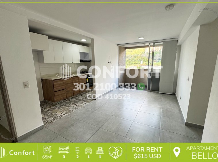 41-05-23 Inmobiliaria en Medellín arrienda apartamento ubicado en el sector de Santa Ana en Bello, cuenta con un área total de 65mt2 distribuidos en sala comedor, cocina integral moderna, balcón, zona de ropas, 3 habitaciones, una de ellas con baño privado, baño social, sala de estudio, parqueadero y cuarto útil. Ubicado en unidad con seguridad privada 24/7 y zonas comunes tales como piscina, sauna, turco, cancha de fútbol, cancha de squash, gimnasio, zona BBQ, zona de juegos, salón social y zonas verdes, a su alrededor podemos encontrar el Hospital Mental de Bello, parque comercial Fabricato, vías de acceso por la autopista norte y gran variedad de transporte público. CONFORT GESTORES INMOBILIARIOS – Arriendo en Bello