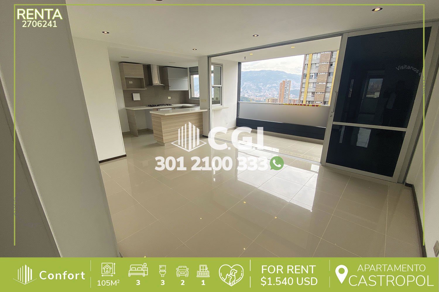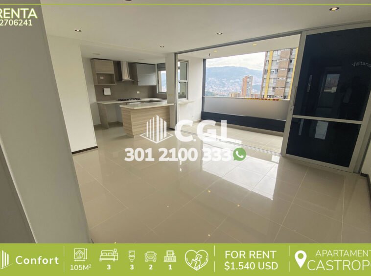 27-06-241 Hermoso y moderno apartamento en el sector de El poblado Castropol, cuenta con 105mt2 distribuidos en 3 habitaciones, baño privado, 2 baños sociales, vestier, sala comedor, cocina integral, zona de ropas, balcón y 2 parqueaderos, con seguridad privada 24/7 y zonas comunes como piscina, sauna, jacuzzi, gimnasio, salón social, juegos infantiles, cancha de microfútbol y zonas verdes. A su alrededor podemos encontrar el Carulla de Las Palmas, edificio Palms 35, rutas de acceso por avenida Las Palmas, avenida inferior, avenida El Poblado y gran variedad de trasporte público. CONFORT GESTORES INMOBILIARIOS – Arriendo en El Poblado