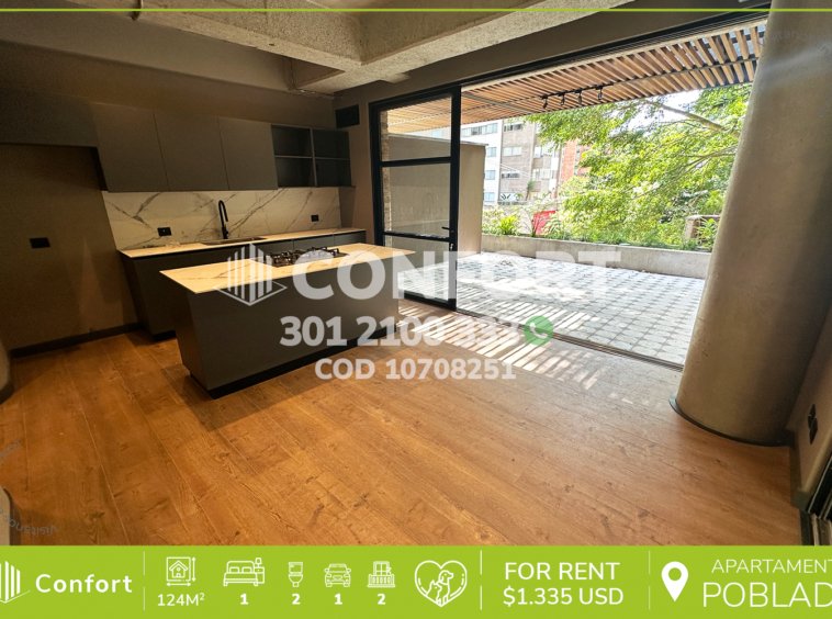 107-08-251 Inmobiliaria en Medellín arrienda apartamento ubicado en el sector de Castropol en El Poblado, cuenta con un área de 124mt2 distribuidos en sala comedor, cocina semi integral con barra americana, zona de ropas, 2 terrazas, una habitación con su respectivo baño privado y vestier, baño social y parqueadero. Ubicado en edificio con seguridad privada 24/7, donde a su alrededor podemos encontrar el parque de El Poblado, Mall Palms Avenue y Carulla, con vías de acceso por las avenidas El Poblado, Las Palmas y gran variedad de transporte público. CONFORT GESTORES INMOBILIARIOS – Arriendo en El Poblado