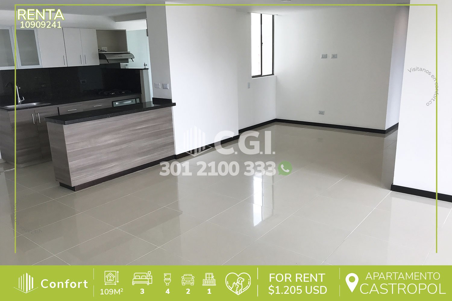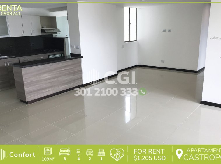 109-09-241 Inmobiliaria en Medellín arrienda apartamento disponible para la renta ubicado en el tranquilo sector de Castropol en El Poblado, cuenta con 109mt2 distribuidos en sala comedor de buen espacio, balcón con vista panorámica, cocina integral con barra americana, zona de ropas, 3 habitaciones cada una con su respectivo baño privado y una de ellas con vestier y las 2 restantes con clóset, baño social, 2 parqueaderos y cuarto útil. Ubicado en unidad cerrada con seguridad privada 24/7 y zonas comunes como piscina para niños y adultos, salón social, turco, gimnasio y cancha de fútbol, a sus alrededores podemos encontrar el gimnasio SmartFit, Mall Palma Grande y Carulla, con rutas de acceso por las avenidas El Poblado, Las Palmas y gran variedad de rutas de transporte público. CONFORT GESTORES INMOBILIARIOS – Arriendo en El Poblado