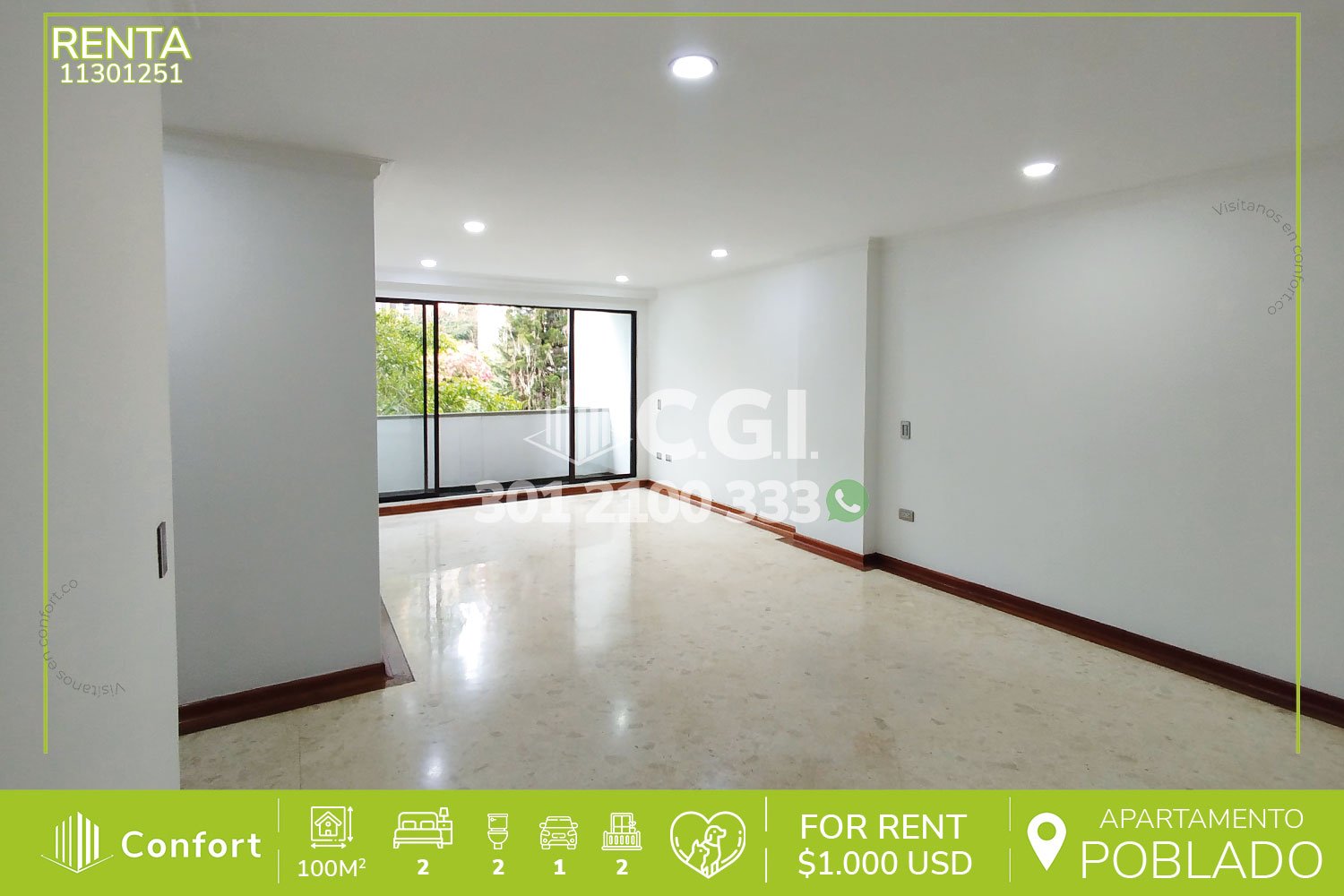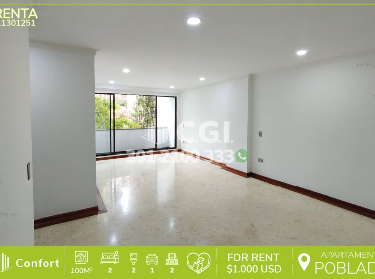 113-01-251 Inmobiliaria en Medellín arrienda apartamento ubicado en el sector de Castropol en El Poblado, cuenta con un área de 100mts2 distribuidos en sala comedor, cocina integral, balcón, zona de ropas, 2 habitaciones con clóset y balcón compartido, la habitación principal cuenta con baño privado, además, podemos encontrar habitación de servicio, baño social, parqueadero y cuarto útil. Ubicado en edificio que cuenta con seguridad privada 24/7 y zonas comunes tales como piscina, turco, zona social y coworking, a su alrededor podemos encontrar Mall Palma Grande, Mall Palms Avenue y el centro comercial Premium Plaza, con vías de acceso por las avenidas El Poblado, Las Palmas y gran variedad de rutas de transporte público. CONFORT GESTORES INMOBILIARIOS – Arriendo en El Poblado