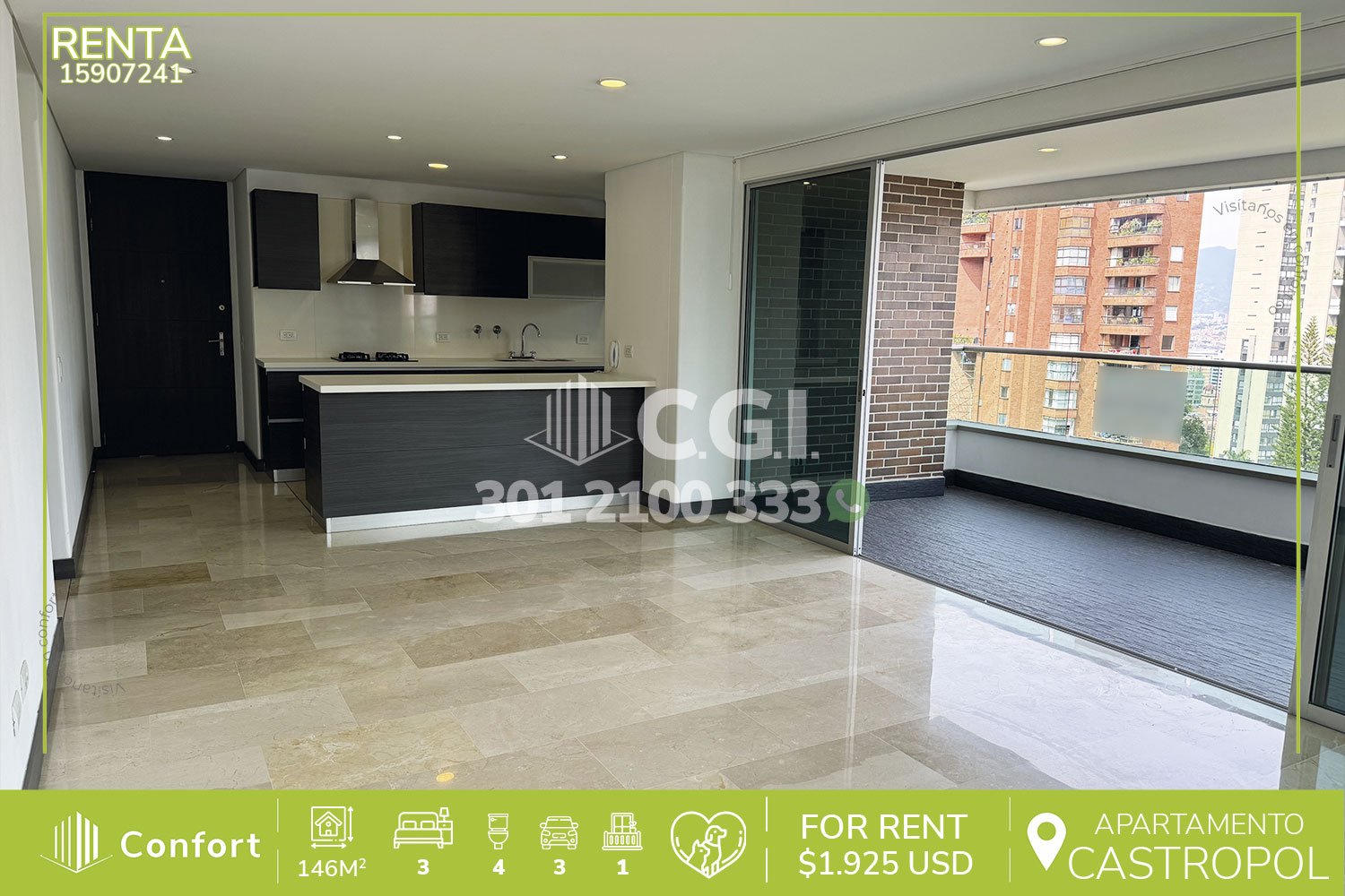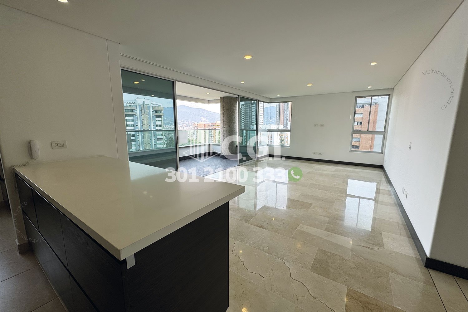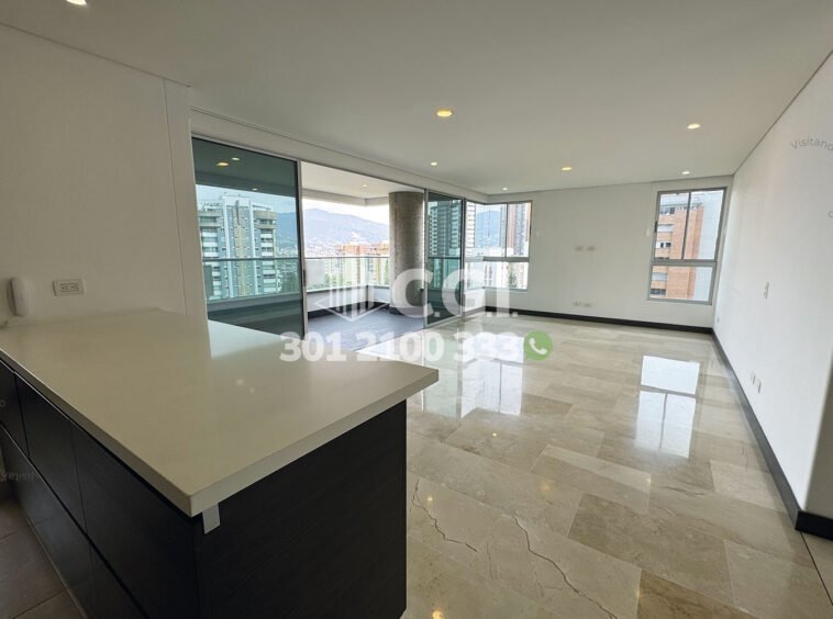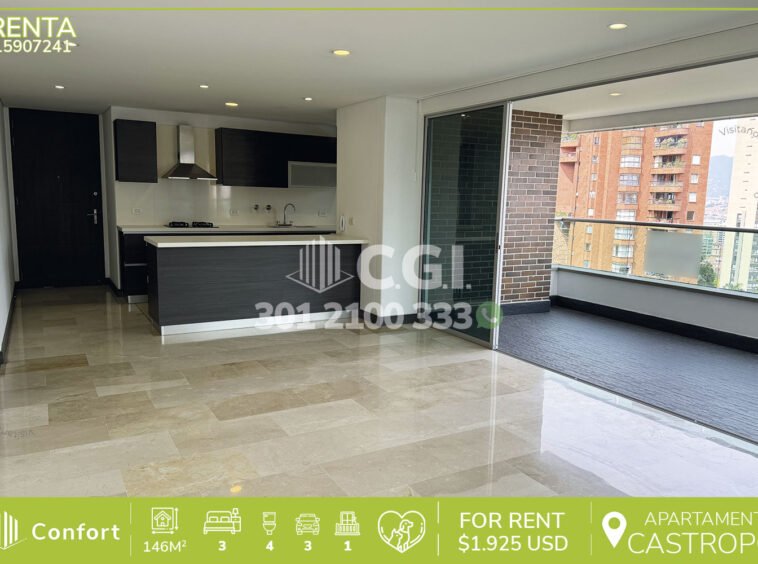 159-07-241 Inmobiliaria en Medellín arrienda hermoso y moderno ubicado en el tranquilo sector de Castropol en El Poblado, cuenta con 146mt2 distribuidos en sala comedor muy iluminada, balcón con una vista panorámica, cocina integral con barra americana y excelente iluminación, zona de ropas, 3 habitaciones cada una son su respectivo baño privado, una de ellas con vestier y las otras 2 con clóset, sala de estudio, 2 parqueaderos y cuarto útil, con vigilancia 24/7 y zonas comunes como piscina para niños y adultos, gimnasio, salón social, parque infantil y cancha de squash. A su alrededor podemos encontrar mall Palmas Avenue, Carulla, parque de El Poblado, rutas de acceso por avenida El Poblado, avenida Las Palmas y gran variedad de transporte público. CONFORT GESTORES INMOBILIARIOS – Arriendo en El Poblado