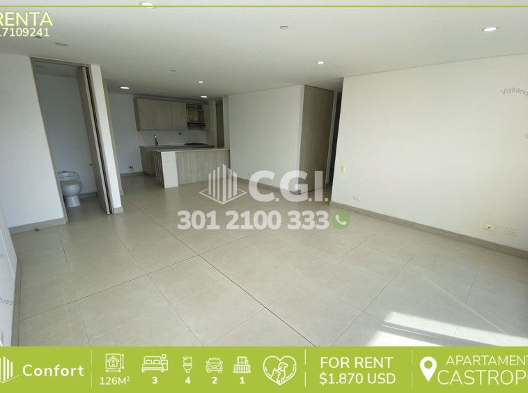 171-09-241 Inmobiliaria en Medellín arrienda apartamento ubicado en tranquilo sector de Castropol en El Poblado, cuenta con 126mt2 distribuidos en sala comedor de muy buen espacio, balcón con vista panorámica, cocina integral con barra americana y excelente iluminación, zona de ropas, 3 habitaciones cada una con su respectivo baño, 2 de ellas con clóset y una de ellas con vestier, baño social, baño de servicio, parqueadero y cuarto útil. Ubicado en unidad con seguridad privada 24/7, además cuenta con zonas comunes como piscina para niños y adultos, salón social, turco, sauna, gimnasio, parque infantil, cancha de squash y cancha de fútbol, a su alrededor podemos encontrar Mall Palmas Avenue, Carulla y parque de El Poblado, con rutas de acceso por las avenidas El Poblado, Las Palmas y gran variedad de rutas de transporte público. CONFORT GESTORES INMOBILIARIOS – Arriendo en El Poblado