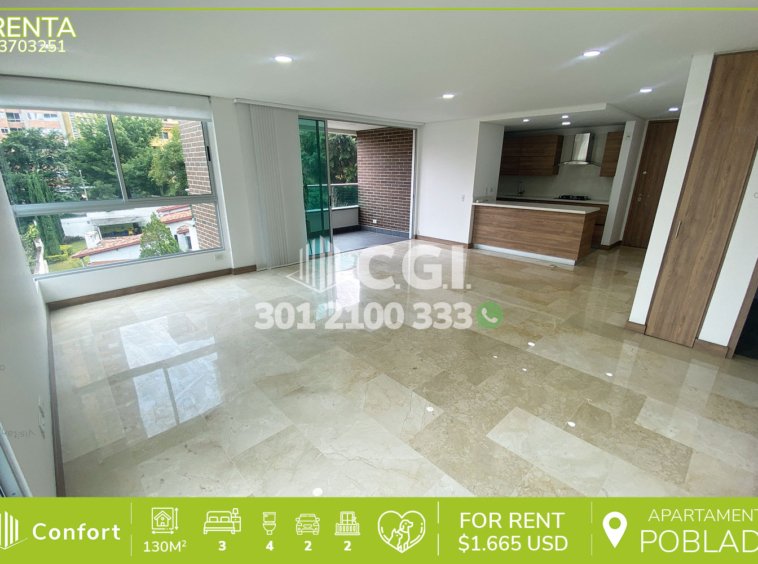 37-03-251 Inmobiliaria en Medellín arrienda apartamento ubicado en el sector de Castropol en El Poblado, cuenta con un área de 130mt2 distribuidos en sala comedor de muy buen espacio, cocina integral con barra americana, zona de ropas, balcón, 3 habitaciones cada una con su respectivo baño privado, una de ellas con balcón privado y vestier, 2 con clóset, baño social, parqueadero doble lineal y cuarto útil. Ubicado en edificio con seguridad privada 24/7 y zonas comunes tales como piscinas para niños y adultos, salón social, gimnasio y parque infantil, a su alrededor podemos encontrar el Mall Palms Avenue, Carulla y el parque de El Poblado, con vías de acceso por las avenidas El Poblado, Las Palmas y gran variedad de rutas de transporte público. CONFORT GESTORES INMOBILIARIOS – Arriendo en El Poblado