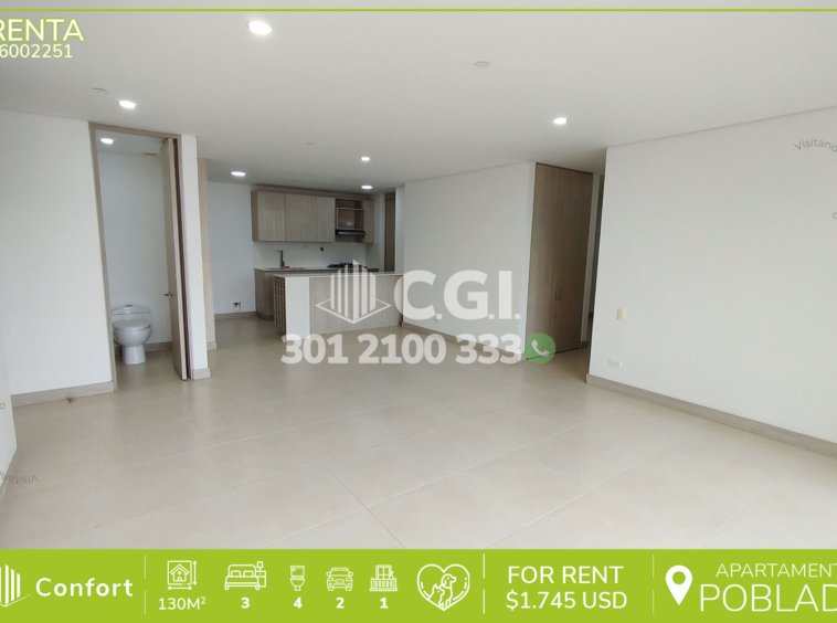 60-02-251 Inmobiliaria en Medellín arrienda apartamento en el sector de Castropol en El Poblado, cuenta con un área de 130 mt2 distribuidos en sala comedor, cocina integral, balcón, sala estar, 3 habitaciones con baño privado, 2 con clóset y una con vestier, sala de estudio, baño social, baño de servicio, 2 parqueaderos y cuarto útil. Ubicado en edificio que cuenta con seguridad privada 24/7 y zonas comunes tales como piscina para adultos y niños, gimnasio, turco, sauna, zona infantil, salón social, cancha sintética, cancha de squash y zona pet, a su alrededor podemos encontrar el centro comercial San Diego, Mall Palms Avenue y Mall Palma Grande, con vías de acceso por las avenidas Las Palmas, El Poblado y gran variedad de rutas de transporte público. CONFORT GESTORES INMOBILIARIOS – Arriendo en El Poblado