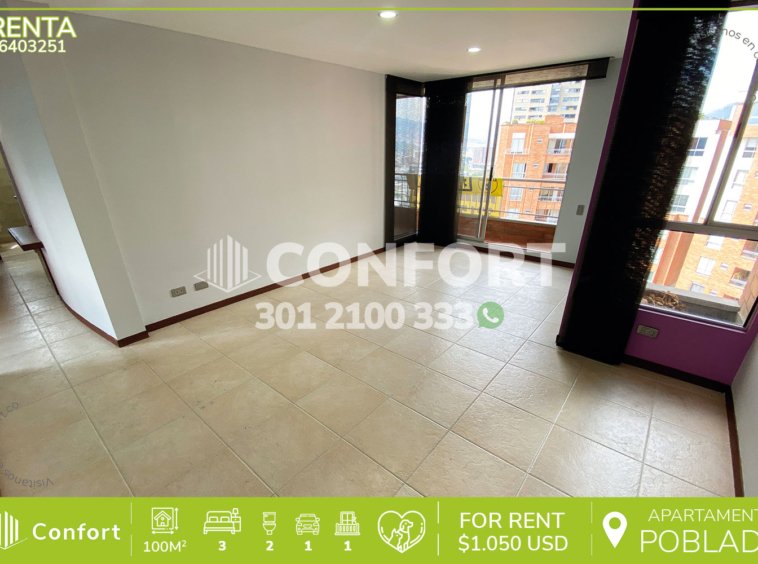 64-03-251 Inmobiliaria en Medellín arrienda apartamento ubicado en el sector de Castropol en El Poblado, cuenta con un área de 100mt2 distribuidos en sala comedor, cocina integral, zona de ropas, balcón, 3 habitaciones, una de ellas con baño privado y vestier, 2 con clóset, sala de estudio, baño social, parqueadero y cuarto útil. Ubicado en unidad cerrada con seguridad privada 24/7 y zonas comunes como piscinas para niños y adultos, salón social, gimnasio, parque infantil y placa polideportiva, a su alrededor podemos encontrar Mall Palms Avenue, Carulla y el parque de El Poblado, con vías de acceso por las avenidas El Poblado, Las Palmas y gran variedad de rutas de transporte público. CONFORT GESTORES INMOBILIARIOS – Arriendo en El Poblado