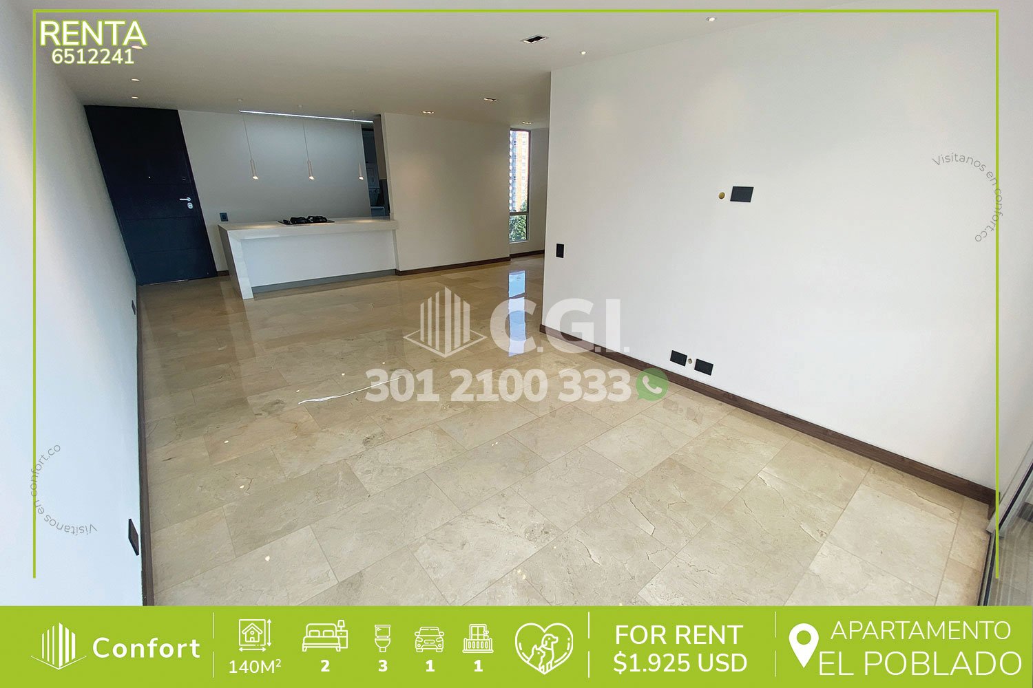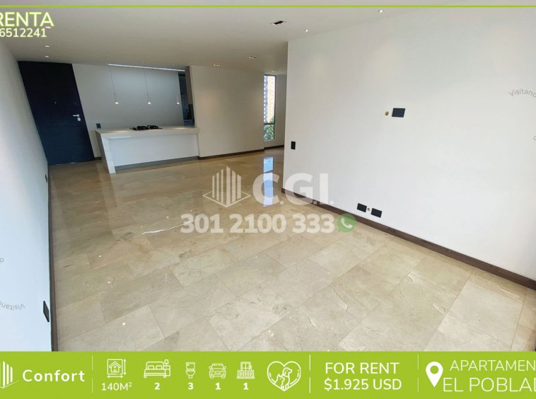 65-12-241 Inmobiliaria en Medellín arrienda apartamento ubicado en el sector de Castropol en El Poblado, cuenta con un área de 140mt2 distribuidos en sala comedor, comedor, cocina semi integral con barra americana y excelente iluminación, zona de ropas, 2 habitaciones con su respectivo baño privado, una de ellas con vestier y jacuzzi, clóset, baño social, habitación de servicio con su respectivo baño privado, balcón con vista panorámica, parqueadero y cuarto útil. Ubicado en edificio con seguridad privada 24/7 y zonas comunes como tales como jacuzzi, salón social, gimnasio y parque infantil, a su alrededor podemos encontrar el parque del Poblado, Mall Palms Avenue y Carulla, con rutas de acceso por las avenidas El Poblado, Las Palmas y gran variedad de transporte público. CONFORT GESTORES INMOBILIARIOS – Arriendo en El Poblado