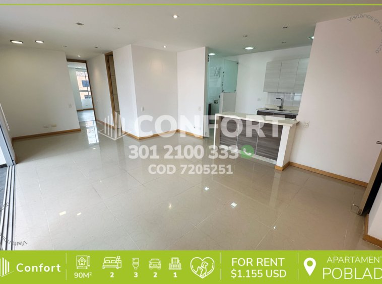 72-05-251 Inmobiliaria en Medellín arrienda apartamento ubicado en el sector de Castropol en El Poblado, cuenta con un área 90mt2 distribuidos en sala comedor, cocina integral con barra americana, zona de ropas, balcón, 2 habitaciones con baño privado, una de ellas con vestier y otra con clóset, baño social, 2 parqueaderos y cuarto útil. Ubicado en edificio con seguridad privada 24/7 y zonas comunes como piscinas para niños y adultos, salón social, gimnasio, parque infantil y turco, a su alrededor podemos encontrar el parque de El Poblado, Mall Palms Avenue y Carulla, con vías de acceso por la avenida El Poblado, Las Palmas y gran variedad de rutas de transporte público. CONFORT GESTORES INMOBILIARIOS – Arriendo en El Poblado