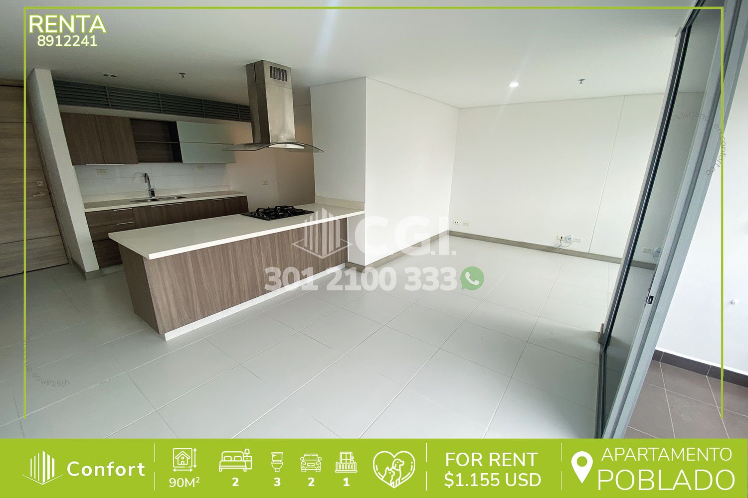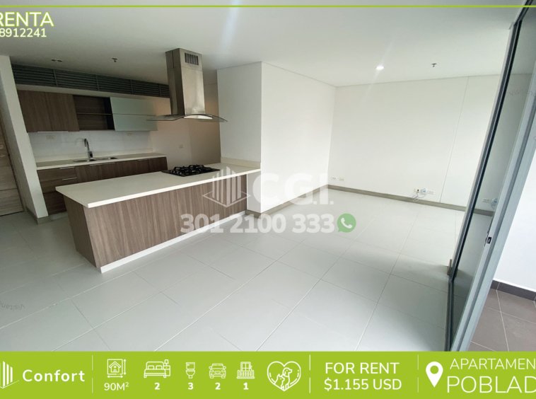 89-12-241 Inmobiliaria en Medellín arrienda apartamento ubicado en el sector de Castropol en El Poblado, cuenta con un área de 90mt2 distribuidos en sala comedor, cocina integral con barra americana, zona de ropas, balcón, 2 habitaciones cada una con su respectivo baño privado, una de ellas con vestier y otra con clóset, baño social y 2 parqueaderos. Ubicado en edificio con seguridad privada 24/7 y zonas comunes como piscina para niños y adultos, salón social, gimnasio, parque infantil y zonas verdes, a su alrededor podemos encontrar el Mall Palms Avenue, Carulla y el parque de El Poblado, con rutas de acceso por las avenidas El Poblado, Las Palmas y gran variedad de transporte público. CONFORT GESTORES INMOBILIARIOS – Arriendo en El Poblado