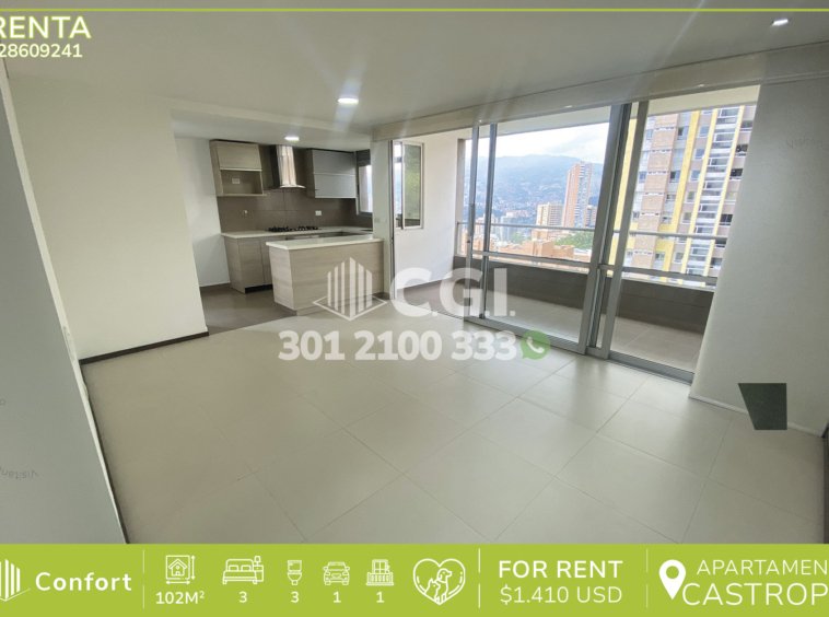 286-09-241 Inmobiliaria en Medellín arrienda apartamento ubicado en el exclusivo sector de Castropol en el Poblado, cuenta con un área de 102mt2 distribuidos en sala comedor de buen espacio, balcón, cocina integral con barra americana, zona de ropas, 3 habitaciones, la principal de ellas con baño privado y vestier, 2 baños sociales, parqueadero y cuarto útil, se encuentra ubicado en unidad residencial con seguridad 24/7 y zonas comunes como piscina para niños y adultos, salón social, gimnasio, parque infantil, turco y zonas verdes. A su alrededor podemos encontrar mall Palms Avenue, Carulla, parque del Poblado. Con vías de acceso por avenida Poblado, avenida las palmas y gran variedad de transporte público. CONFORT GESTORES INMOBILIARIOS – Arriendo en el Poblado