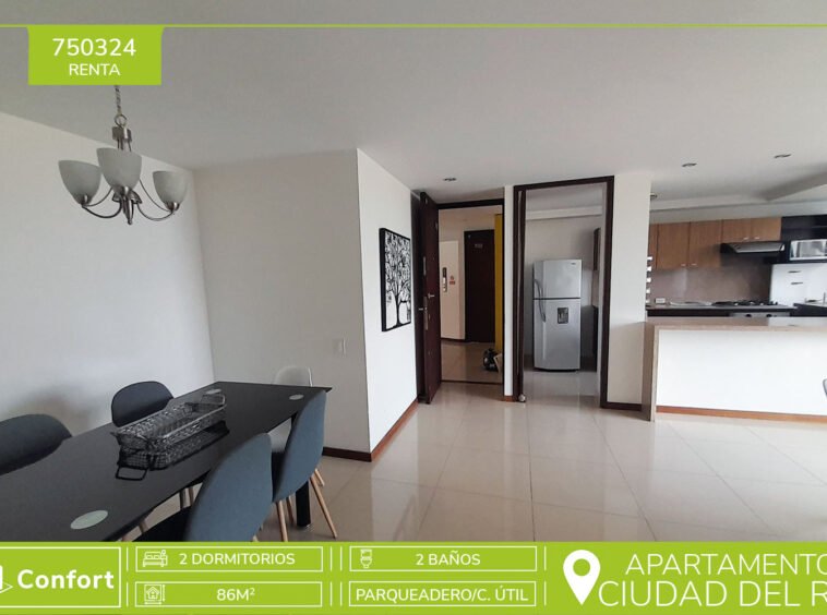 75-03-24 Hermoso Apartamento disponible para la renta ubicado en el sector de Ciudad del Rio. Cuenta con una área aproximada de 86 mt2, distribuidos en sala comedor amplia, cocina integral con extractor de olores y horno, Barra americana , 1 baño social, 2 habitaciones, closet, la habitación principal cuenta con un baño privado y vestier, balcón, zona de ropas, cuarto útil y parqueadero privado. Ubicado en unidad residencial con seguridad 24/7, que cuenta con áreas comunes como salón social, gimnasio, piscina, parque infantil, sauna , turco, Placa polideportivo y zonas verdes. A tu alrededor podemos encontrar Museo de arte moderno de Medellín, Comfama Ciudad del Río, Clínica del Prado, Parque Lineal Ciudad del Río. Con rutas de acceso por avenida las Vegas, avenida Regional, avenida el Poblado y diferentes rutas de transporte público. CONFORT INMOBILIARIA