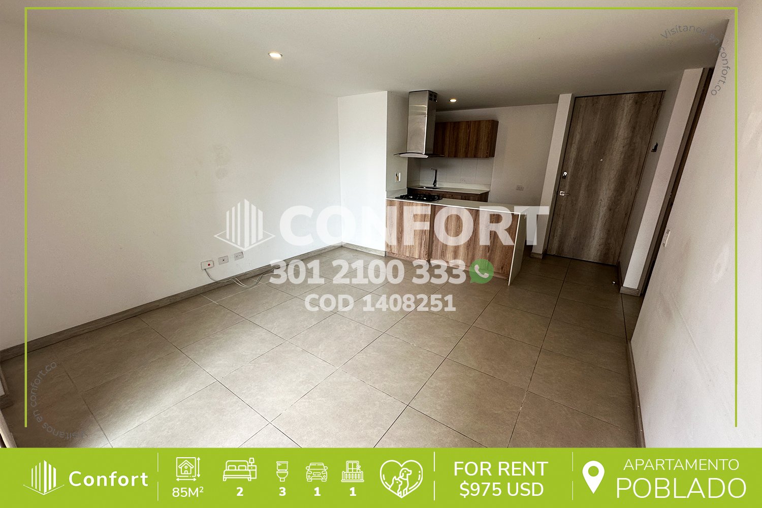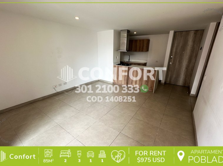 14-08-251 Inmobiliaria en Medellín arrienda apartamento ubicado en el sector de Ciudad del Río en El Poblado, cuenta con un área 85mt2, distribuidos en sala comedor, zona de ropas, balcón, cocina integral con barra americana, baño social, 2 habitaciones con baño privado, parqueadero cubierto y cuarto útil. Ubicado en unidad con seguridad privada 24/7 y zonas comunes como piscina semi olímpica, juegos infantiles, gimnasio, turco y zonas verdes, a su alrededor podemos encontrar el Museo de Arte Moderno Medellín, Homecenter Poblado y Mercados del Río, con vías de acceso por la avenida Las Vegas, El Poblado y amplia variedad de rutas de transporte público. CONFORT GESTORES INMOBILIARIOS – Arriendo en El Poblado