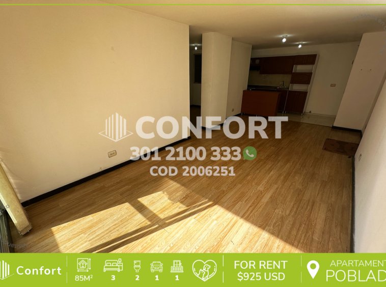 20-06-251 Inmobiliaria en Medellín arrienda apartamento ubicado en Ciudad del Río en El Poblado, cuenta con un área de 85mt2 distribuidos en sala comedor, cocina integral, zona de lavado, 3 habitaciones, 2 de ellas con clóset, la principal con vestier y baño privado, baño social, sala de estudio y parqueadero. Ubicado en edificio con seguridad privada 24/7 y zonas comunes que se distribuyen en piscina para adultos y niños, zona de juegos, gimnasio, salón social y zonas verdes, a su alrededor podemos encontrar el Éxito Ciudad del Río, clínica Clofán, vías de acceso por las avenidas El Poblado, Las Vegas y gran variedad de transporte público. CONFORT GESTORES INMOBILIARIOS – Arriendo en El Poblado