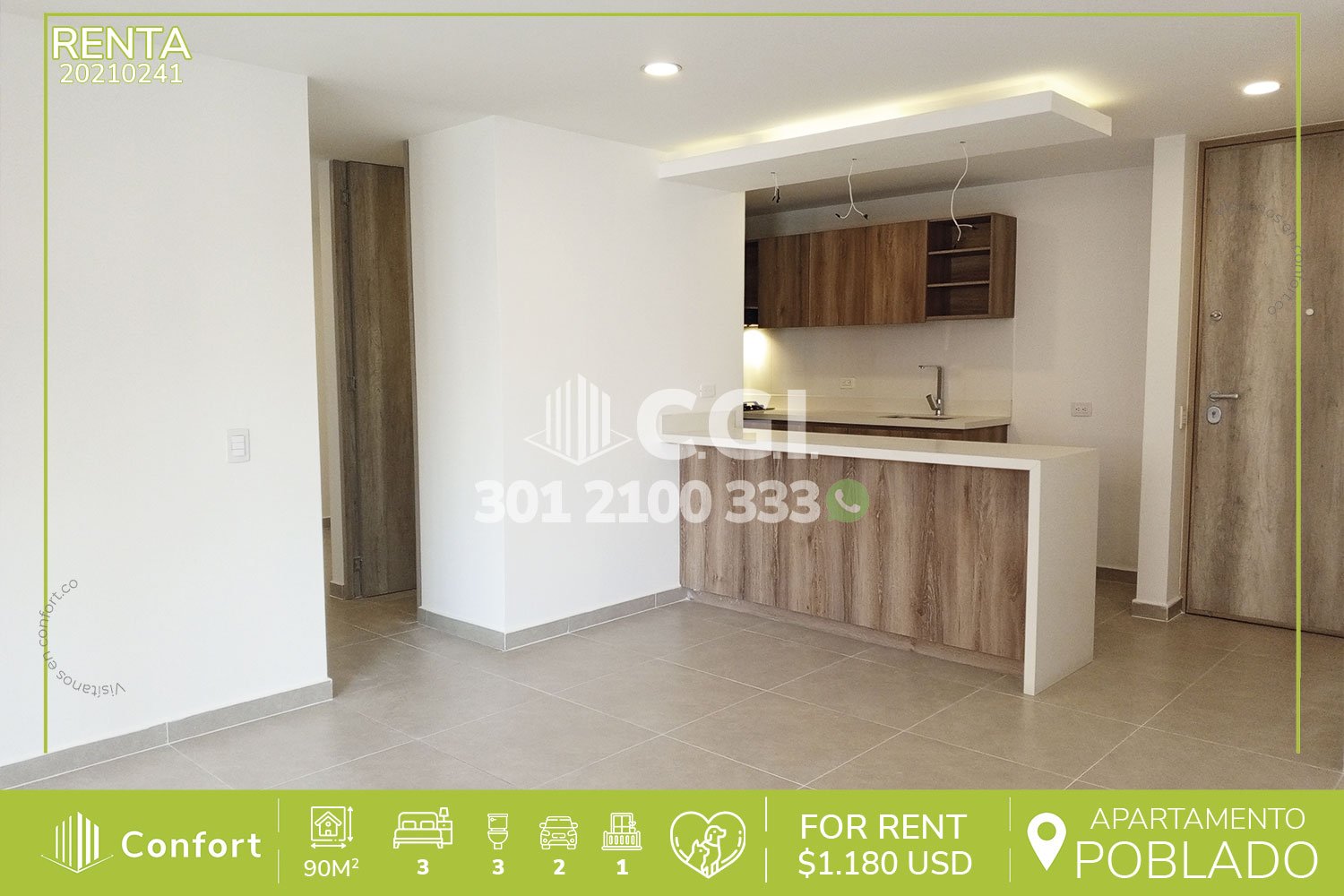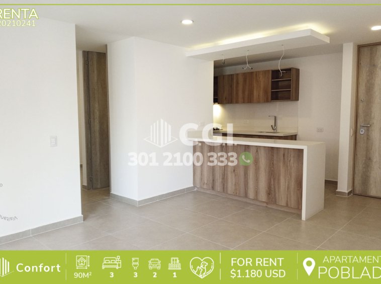 202-10-241 Inmobiliaria en Medellín arrienda apartamento en Ciudad del Río en El Poblado, cuenta con un área de 90mt2 distribuidos en sala comedor, cocina integral con barra americana, zona de ropas, balcón, sala de estudio, 3 habitaciones una de ellas con vestier, baño privado y las otras 2 con clóset, 2 baños sociales, parqueadero doble y cuarto útil. Ubicado en unidad con seguridad privada 24/7 y con zonas comunes tales como piscinas para niños y adultos, salón social, gimnasio, zona infantil y zonas verdes, a su alrededor podemos encontrar la clínica Clofam, centro comercial Premium Plaza, museo de arte moderno y Homecenter, con rutas de acceso por las avenidas El Poblado, Las Vegas, regional y gran variedad de rutas de transporte público. CONFORT GESTORES INMOBILIARIOS – Arriendo en El Poblado