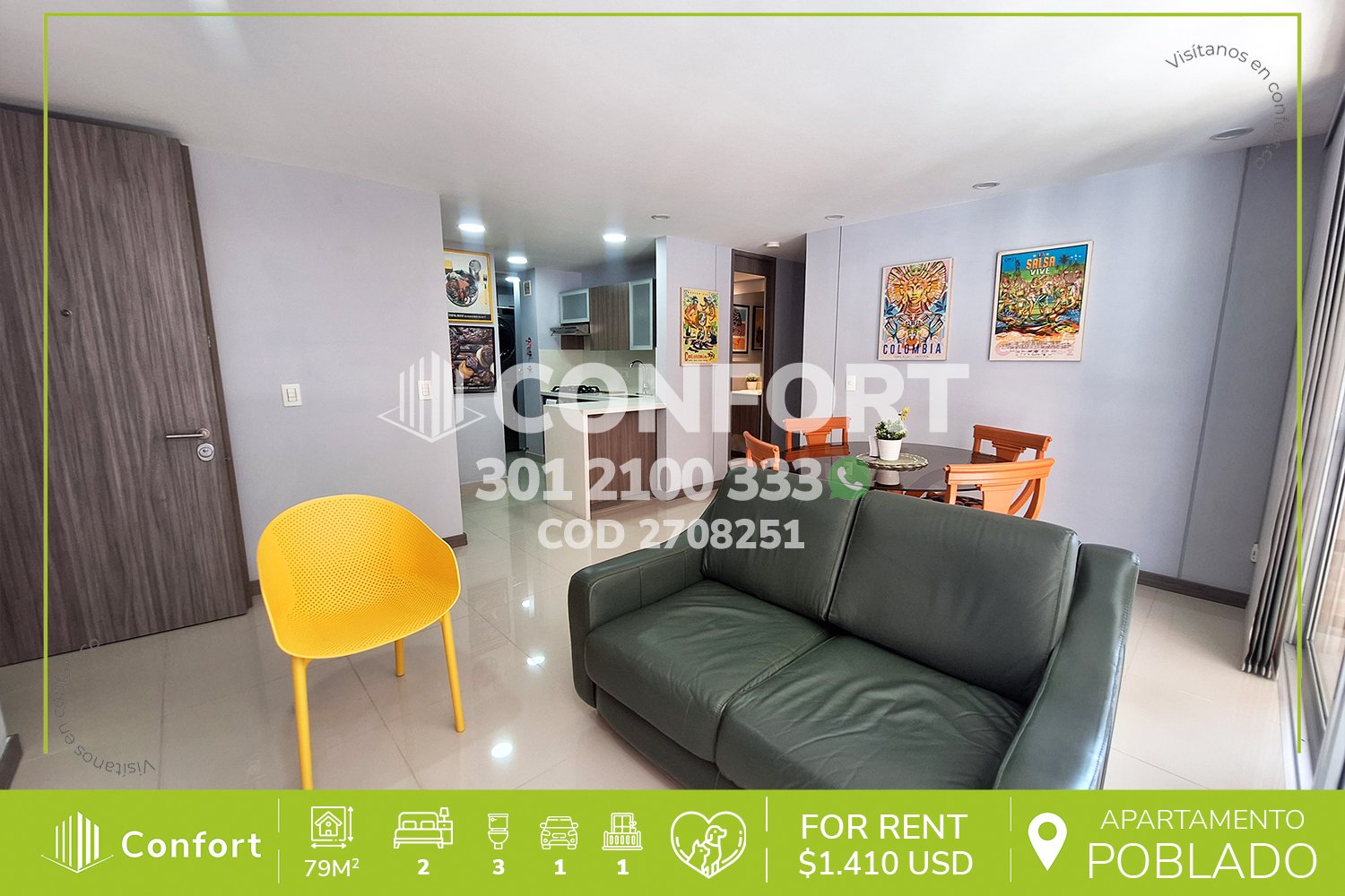 27-08-251 Inmobiliaria en Medellín arrienda apartamento ubicado en el sector de Ciudad del Río en El Poblado, cuenta con área de 79mts2 distribuidos en sala comedor amplia, cocina integral con barra americana, zona de ropas, balcón, 2 habitaciones con vestier y baño privado, baño social y parqueadero. Ubicado en unidad cerrada con seguridad privada 24/7 y zonas comunes como 2 piscinas, una cubierta y otra al aire libre, sauna, turco, gimnasio, placa polideportiva, juegos infantiles, mesa de ping pong, cancha de squash y zonas verdes, a su alrededor podemos encontrar el centro comercial Premium Plaza, Museo de Arte Moderno y el centro comercial automotriz, con vías de acceso por las avenidas Las Vegas, El Poblado, La 30 y amplia variedad de rutas de transporte público. CONFORT GESTORES INMOBILIARIOS – Arriendo en El Poblado