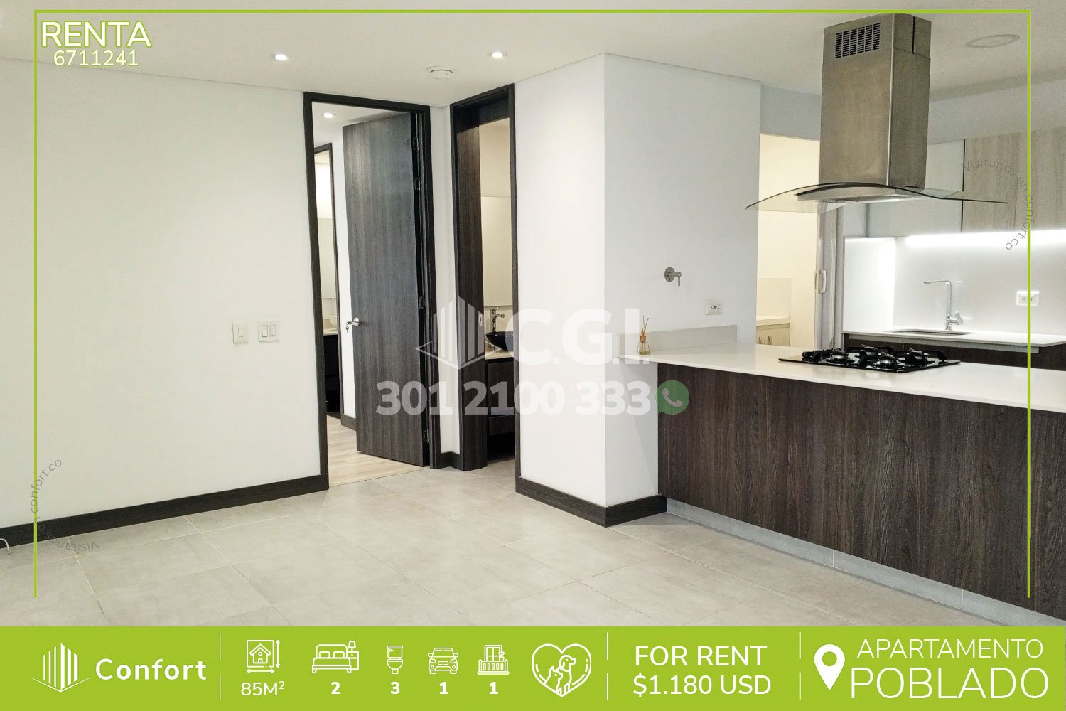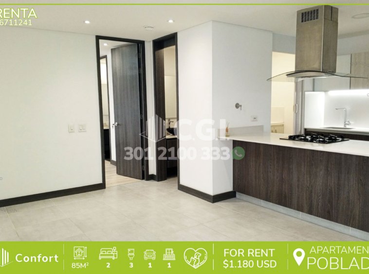 67-11-241 Inmobiliaria en Medellín arrienda apartamento ubicado en tranquilo sector de Ciudad del Río en El Poblado, cuenta con 85mt2 distribuidos en sala comedor de muy buen espacio, cocina integral, zona de ropas, balcón, 2 habitaciones con su respectivo baño privado y vestier, baño socia y parqueadero. Ubicado en unidad con seguridad privada 24/7 y con zonas comunes, tales como salón social, parque, gimnasio, zona de mascotas, cancha de fútbol, gimnasio y zonas verdes, a su alrededor podemos encontrar el centro comercial Premium Plaza, estación del metro Industriales y el Museo de Arte de Medellín, con rutas de acceso por las avenidas El Poblado, Regional, Las Vegas y gran variedad de rutas de transporte público. CONFORT GESTORES INMOBILIARIOS – Arriendo en El Poblado