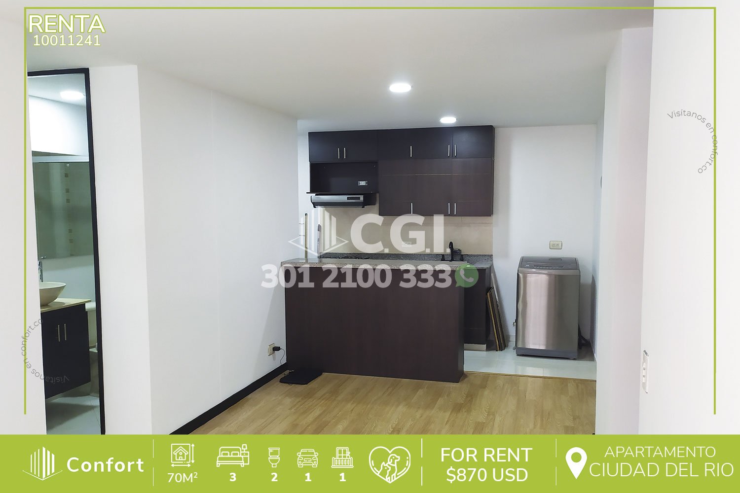100-11-241 Inmobiliaria en Medellín renta apartamento ubicado en el sector de Ciudad del Rio – Medellín, cuenta con un área de 70 mts2 distribuidos en sala comedor, cocina integral con barra americana, balcón, zona de ropas, 3 habitaciones, una de ellas con baño privado y closet, las otras 2 con closet, baño social y parqueadero. Ubicado en unidad cerrada que cuenta con seguridad privada 24/7 y zonas comunes tales como shut de basuras, ascensor, piscina para adultos y niños, gimnasio, zona infantil, zona de mascotas y zonas verdes, a su alrededor podemos encontrar Museo de Arte Moderno de Medellín, Mercados del Rio y parque lineal Ciudad del Rio, con vías de acceso por avenida El Poblado, avenida Regional, avenida Las Vegas y gran variedad de rutas de transporte público. CONFORT GESTORES INMOBILIARIOS – Arriendo en Medellín