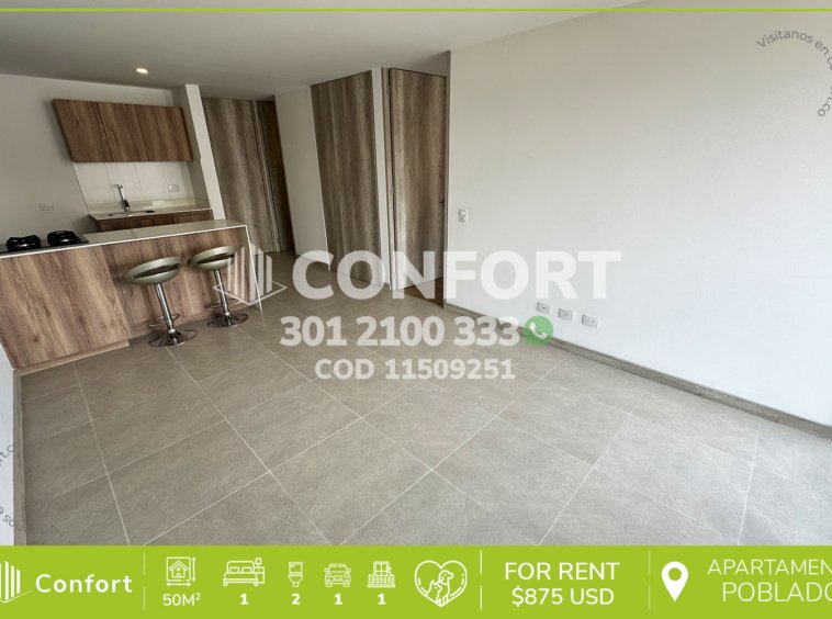 115-09-251 Inmobiliaria en Medellín arrienda apartamento ubicado en el sector Ciudad del Río en Poblado. Cuenta con un área de 50 mts distribuidos en sala comedor, cocina semi integral con barra americana, zona de ropas , balcón , habitación con baño privado y vestier, baño social y parqueadero. Ubicado en unidad residencial con seguridad 24/7. Cuenta con zonas comunes distribuidas en piscina niños y adultos, salón social, gimnasio, parque infantil y zonas verdes. A su alrededor podemos encontrar, clínica Clofam , Éxito, Museo de arte moderno. Con rutas de acceso por Avenida poblado, Avenida las Vegas y gran variedad de transporte público. CONFORT GESTORES INMOBILIARIOS – Arriendo en Poblado