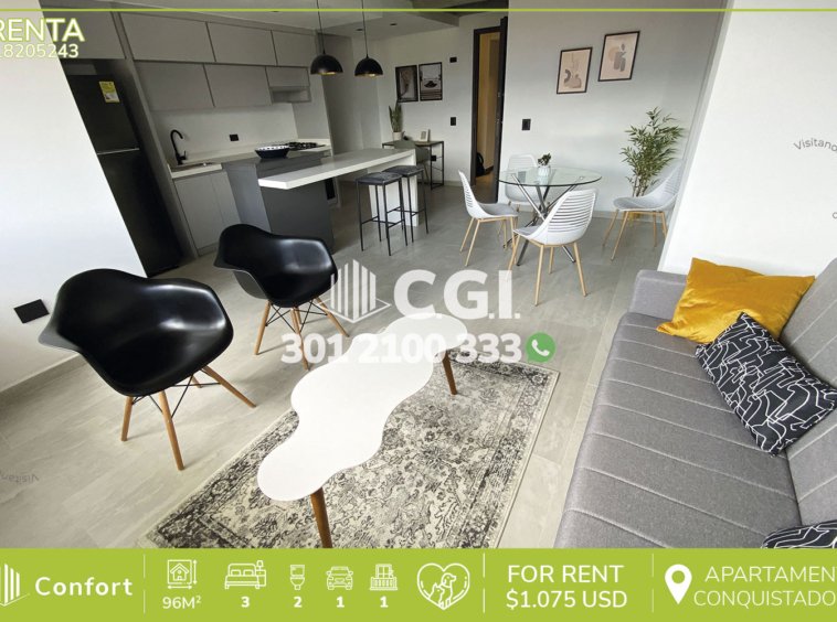 182-05-243 Hermoso y moderno apartamento, disponible para la renta ubicado en el sector de Conquistadores en Medellín. Cuenta con un área de 96mt² distribuidos en 3 habitaciones, la principal con baño privado y balcón, 1 baños social, cocina semi integral moderna, sala comedor, zona de ropas, parqueadero, dotado con todo lo necesario para pasar una excelente estadía, ubicado en edificio con seguridad 24/7 y zonas de interés cercanas como el Centro Comercial Unicentro, Pueblito Paisa, restaurantes y más, con vías de acceso por avenida San Juan, avenidas 65, avenida 33 y gran variedad de rutas de transporte público. CONFORT GESTORES INMOBILIARIOS – Arriendo en Medellín