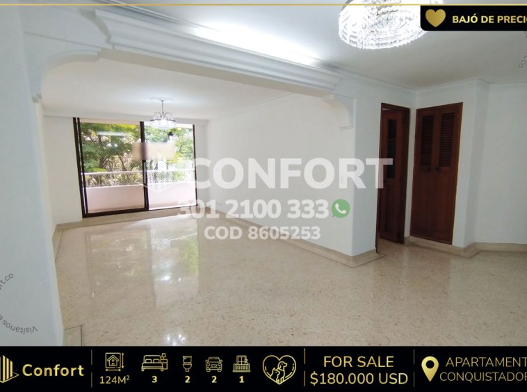 86-05-253 Inmobiliaria en Medellín vende apartamento ubicado en el sector de Conquistadores en Medellín, cuenta con un área de 124mt2 distribuidos en sala comedor, cocina integral, balcón con conexión a zona de estudio con biblioteca, zona de ropas, 3 habitaciones, una de ellas con vestier y baño privado, habitación de servicio con baño privado, 2 parqueaderos y 2 cuarto útil. Ubicado en edificio con seguridad privada 24/7, donde a su alrededor podemos encontrar el centro comercial Unicentro, Makro y Homecenter de San Juan, con vías de acceso por la avenida 33 con la 65, avenida bolivariana y gran variedad de transporte público. CONFORT GESTORES INMOBILIARIOS – Venta en Medellín