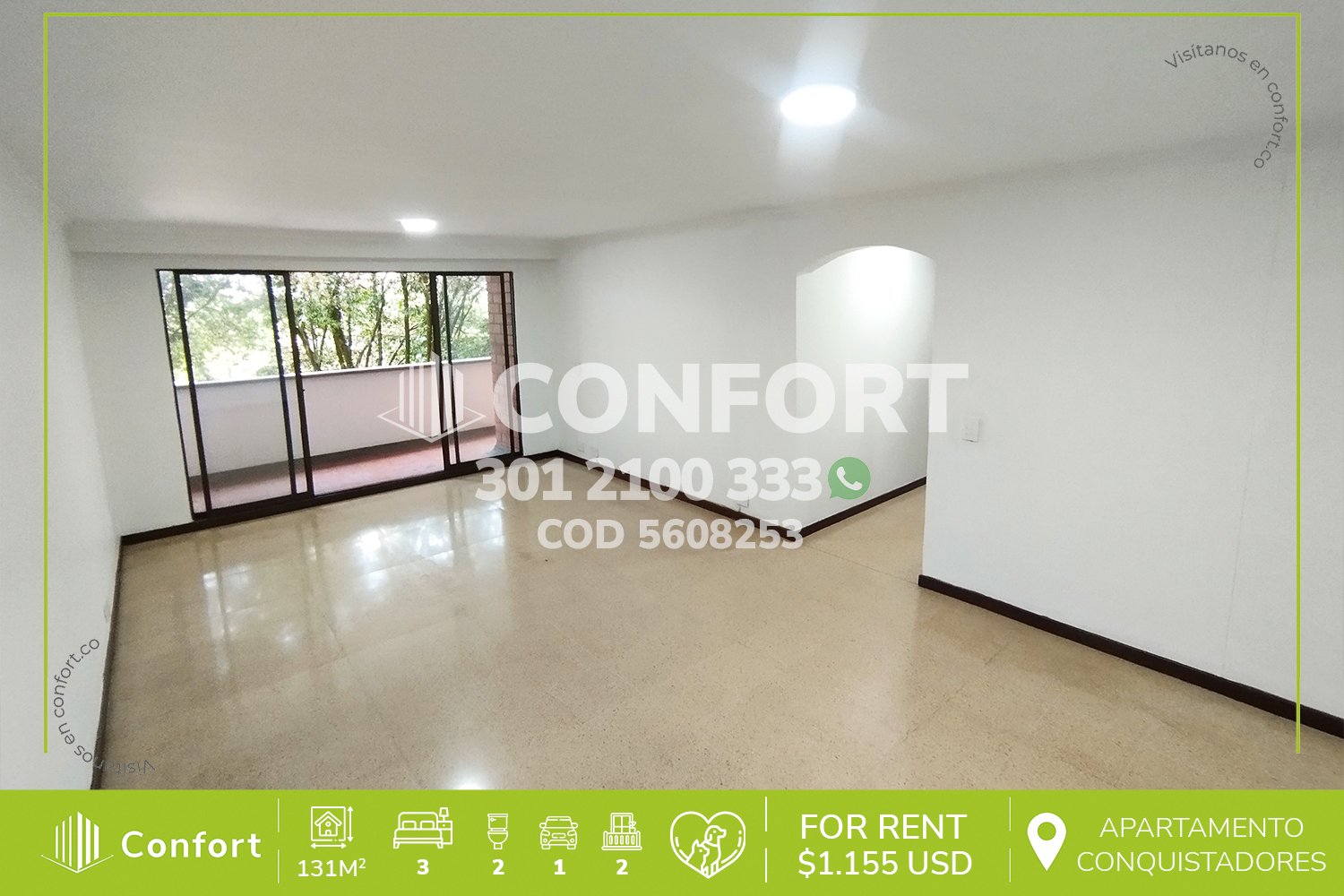 56-08-253 Inmobiliaria en Medellín arrienda apartamento ubicado en el sector de Conquistadores, cuenta con un área de 131mt2 distribuidos en sala comedor, cocina integral, balcón social, 3 habitaciones una de ellas con balcón, baño privado y vestier, zona de estudio, zona de ropas, habitación de servicio con baño, baño social, parqueadero y cuarto útil. Ubicado en edificio con seguridad privada 24/7, donde a su alrededor podemos encontrar Parques del Río, centro administrativo La Alpujarra, vías de acceso por las avenidas 33, Regional, Bolivariana y gran variedad de transporte público. CONFORT GESTORES INMOBILIARIOS – Arriendo en Medellín