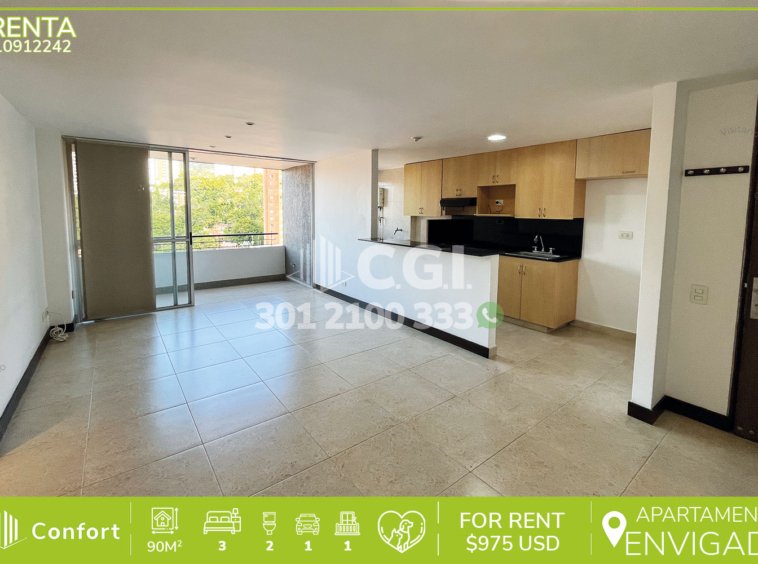 109-12-242 Inmobiliaria en Medellín arrienda apartamento ubicado en tranquilo sector de Cumbres en Envigado, cuenta con un área de 90mt2 distribuidos en sala comedor de muy buen espacio, sala de estudio, cocina integral con barra americana, zona de ropas, balcón, 3 habitaciones, 2 de ellas con clóset, una con vestier y baño privado, baño social, parqueadero y cuarto útil. Ubicado en unidad con seguridad 24/7 y con zonas comunes tales como, piscina para adultos y niños, salón social y zona de mascotas, a su alrededor podemos encontrar el supermercado Carulla, centro comercial City Plaza y el parque Las Cometas, con rutas de acceso por la avenida El Escobero, trasversal intermedia y gran variedad de rutas de transporte público. CONFORT GESTORES INMOBILIARIOS – Arriendo en Envigado