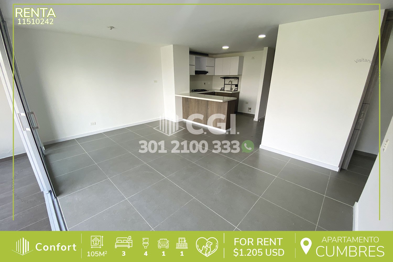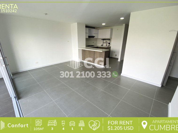 115-10-242 Inmobiliaria en Medellín arrienda apartamento ubicado en el sector de Cumbres en Envigado, cuenta con 105mt2 distribuidos en sala comedor de buen espacio, cocina integral con barra americana, zona de ropas, 3 habitaciones cada una con su respectivo baño privado, una de ellas con vestier y las otras 2 con clóset, sala de estudio, baño social, parqueadero y cuarto útil. Ubicado en edificio con seguridad privada 24/7 y con zonas comunes como piscina para niños y adultos, salón social, gimnasio, cancha de microfútbol, zona infantil y zonas verdes, a su alrededor podemos encontrar Inder Las Cometas, colegio Cumbres y el Mall Terracina Plaza, con rutas de acceso por la transversal intermedia, avenida El Poblado y gran variedad de rutas de transporte público. CONFORT GESTORES INMOBILIARIOS – Arriendo en Envigado
