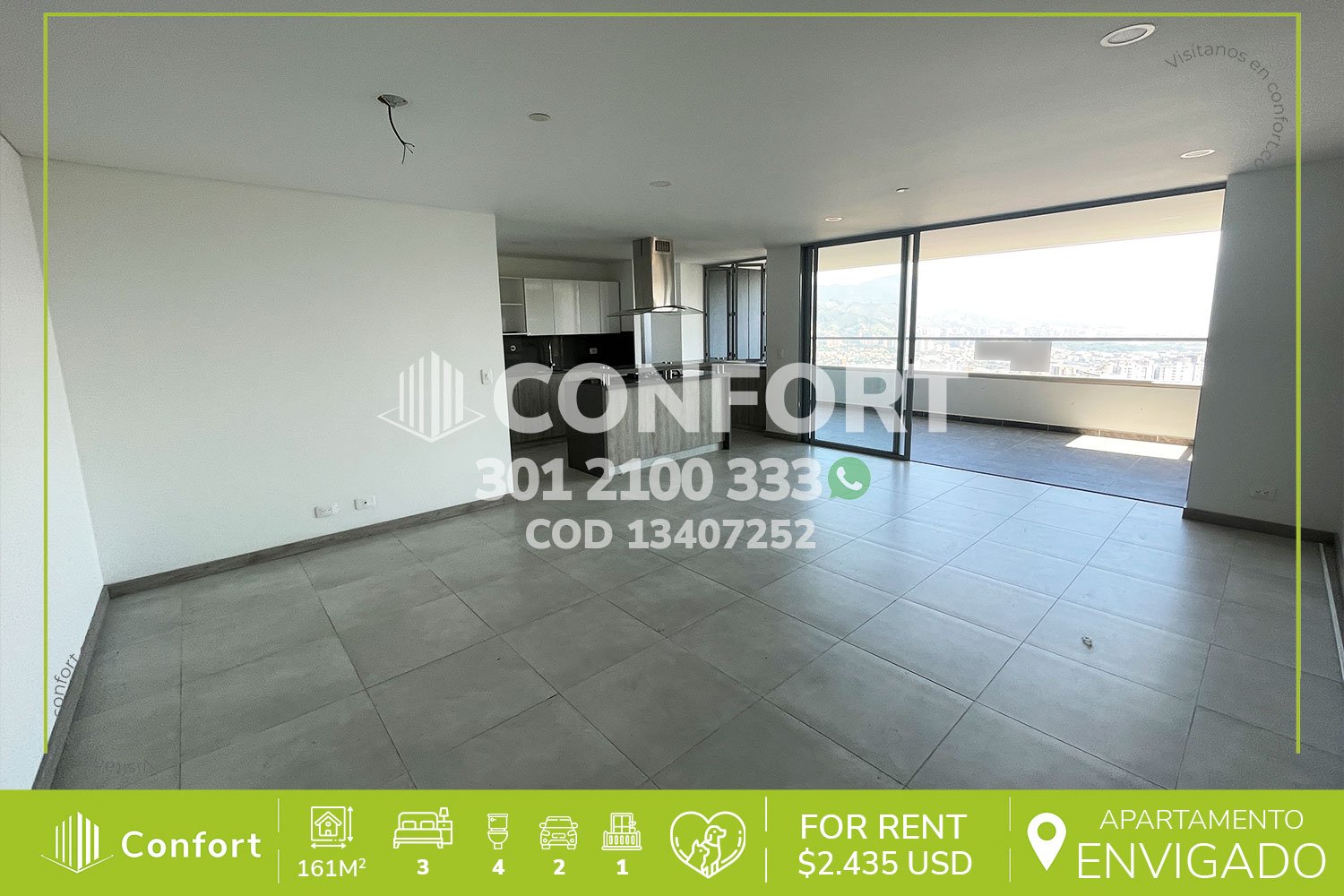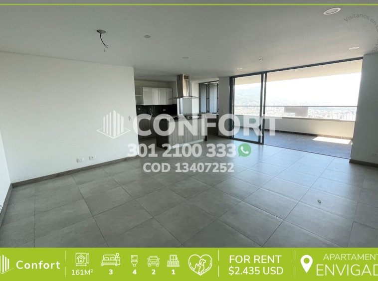 134-07-252 Inmobiliaria en Medellín arrienda apartamento ubicado en el sector Cumbres en Envigado, cuenta con un área de 161mt2 distribuidos en sala comedor, cocina integral en isla, lavavajillas y acabados modernos, amplio balcón, zona de lavado, 3 habitaciones con baño privado y vestier, baño social, habitación de servicio, zona de estudio, 2 parqueaderos y cuarto útil. Ubicado en unidad con seguridad privada 24/7 y zonas comunes como piscinas para niños y adultos, salón social, zona infantil, turco, sala de cine, salón de juegos y zonas verdes, a su alrededor podemos encontrar Mall Terracina, gimnasio Smartfit y el parque La Guayacana, con vías de acceso por La Avenida El Poblado, transversal intermedia y gran variedad de rutas de transporte público. CONFORT GESTORES INMOBILIARIOS – Arriendo en Envigado