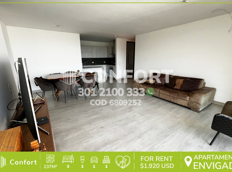 68-09-252 Inmobilairia en Medellín arrienda apartamento ubicado en el sector de Cumbres en Envigado, cuenta con un área de 137m² distribuidos en sala comedor, cocina integral, zona de ropas, 3 habitaciones y 1 de servicio, 3 baños privados, vestier, closet, parqueadero doble cubierto. Ubicado en urbanización con seguridad privada 24/7 y con zonas comunes zonas verdes, gimnasio, cancha de squash, piscina adultos y niños, mesa de billar, ping pong, turco y sauna, a su alrededor podemos encontrar el Mall Terracina Plaza y Mall Comercial Distrito Avignon, con vías de acceso por la avenida El Poblado y gran variedad de rutas de transporte público. CONFORT GESTORES INMOBILIARIOS – Arriendo en Envigado