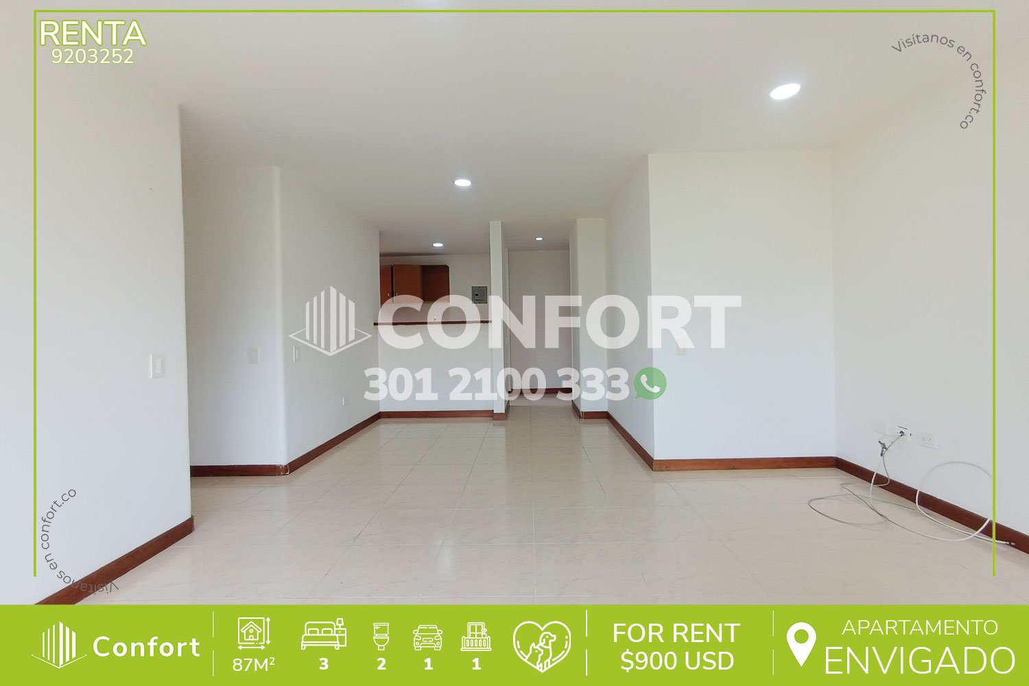 92-03-252 Inmobiliaria en Medellín arrienda apartamento ubicado en excelente sector de Cumbres en Envigado, cuenta con un área de 87mt2 distribuidos en sala comedor espaciosa, cocina integral, zona de ropas, 3 habitaciones de excelente tamaño, la habitación principal cuenta con vestier y baño privado, adicional podemos encontrar un baño social, amplio balcón, parqueadero y cuarto útil. Ubicado en urbanización con seguridad privada 24/7 y con zonas comunes como piscina, turco, sauna, salón social, gimnasio, parque infantil y zona pet, a su alrededor podemos encontrar el colegio Cumbres e Inder de Envigado, con vías de acceso por la avenida El Poblado y gran variedad de rutas de transporte público. CONFORT GESTORES INMOBILIARIOS – Arriendo en Envigado