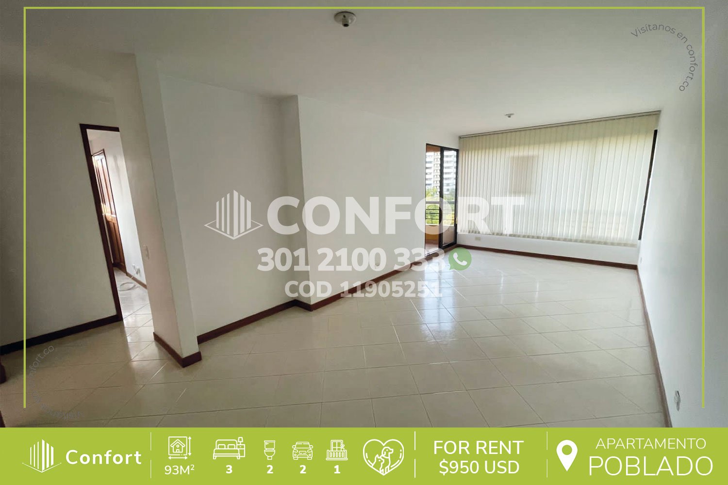 119-05-251 Inmobiliaria en Medellín arrienda apartamento ubicado en el sector de El Campestre en El Poblado, cuenta con área de 93mt2 distribuidos en sala comedor, cocina integral, zona de ropas, baño social, balcón, 3 habitaciones, una de ellas con vestier y baño privado, 2 con clóset, parqueadero y cuarto útil. Ubicado en unidad con seguridad privada 24/7 y zonas comunes como piscina, gimnasio, juegos infantiles y zonas verdes, a su alrededor podemos encontrar el Mall La Frontera, Mall São Paulo Plaza y Carulla San Lucas, con vías de acceso por la avenida El Poblado, transversal superior y gran variedad de rutas de transporte público. CONFORT GESTORES INMOBILIARIOS – Arriendo en El Poblado