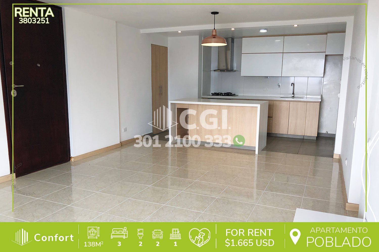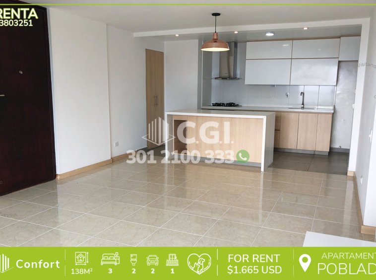 38-03-251 Inmobiliaria en Medellín arrienda apartamento ubicado en el sector de El Campestre en El Poblado, cuenta con un área de 138mts2 distribuidos en sala comedor, cocina integral, balcón, zona de ropas, habitacion de servicio con baño privado, 3 habitaciones, una de ellas con vestier y baño privado, las 2 auxiliares con clóset, además cuenta con, baño social, sala de estudio, 2 parqueaderos y 2 cuarto útil. Ubicado en unidad con seguridad privada 24/7 y zonas comunes tales como piscinas, jacuzzi, turco, salón social, gimnasio, juegos infantiles y zonas verdes, a su alrededor podemos encontrar Angrymom Tattoo San lucas, Carulla Fresh Market San Lucas, Miel de Abeja El Rebaño, Mall San Lucas y São Paulo Plaza, con vías de acceso por la transversal inferior, avenida El Poblado y gran variedad de rutas de transporte público. CONFORT GESTORES INMOBILIARIOS – Arriendo en El Poblado