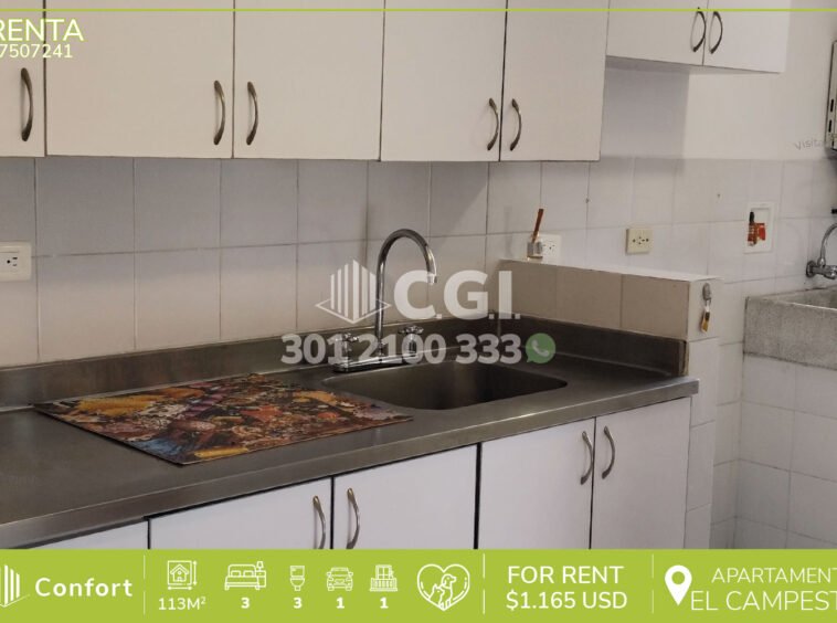 75-07-241 Inmobiliaria en Medellín arrienda apartamento de El Campestre en El Poblado, consta de 113 m² distribuidos en sala comedor amplia, cocina semi-integral, zona de ropas, espacio que puede ser utilizado como estudio o biblioteca, 3 habitaciones, de las cuales la principal cuenta con baño privado y vestier, 2 baños sociales, parqueadero y cuarto útil, además, al estar ubicado en unidad cerrada cuenta con zonas comunes tales como, cancha de baloncesto y microfútbol, piscina para adultos y niños, gimnasio, sauna, salón social, zona de juegos para mascotas y niños. A sus alrededores podemos encontrar Carulla, Mall San Lucas, y Centro Comercial Santafé, con vías de acceso como la Avenida El Poblado, avenida Las Vegas y excelentes rutas de transporte. CONFORT GESTORES INMOBILIARIOS – Arriendo en El Poblado