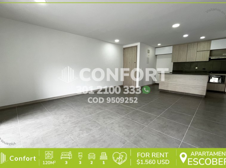 95-09-252 Inmobiliaria en Medellín arrienda apartamento ubicado en sector El Escobero en Envigado. Cuenta con un área de 52 m² distribuidos en sala-comedor, cocina integral, zona de ropas, 3 habitaciones, 2 baños privados, 1 baño social, closets y 2 parqueaderos cubiertos lineales. Ubicado en edificio con seguridad 24/7, zonas verdes, turco, piscina de adultos, juegos infantiles y gimnasio. A su alrededor podemos encontrar Farmatodo y Mall Terracina, con vías de acceso por la Transversal Intermedia y la Loma del Escobero, además de variedad de rutas de transporte público.