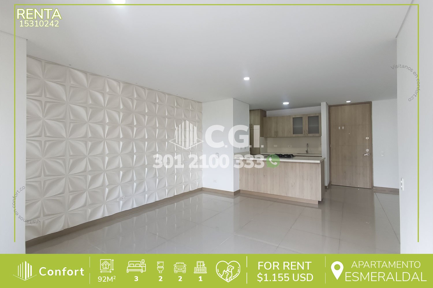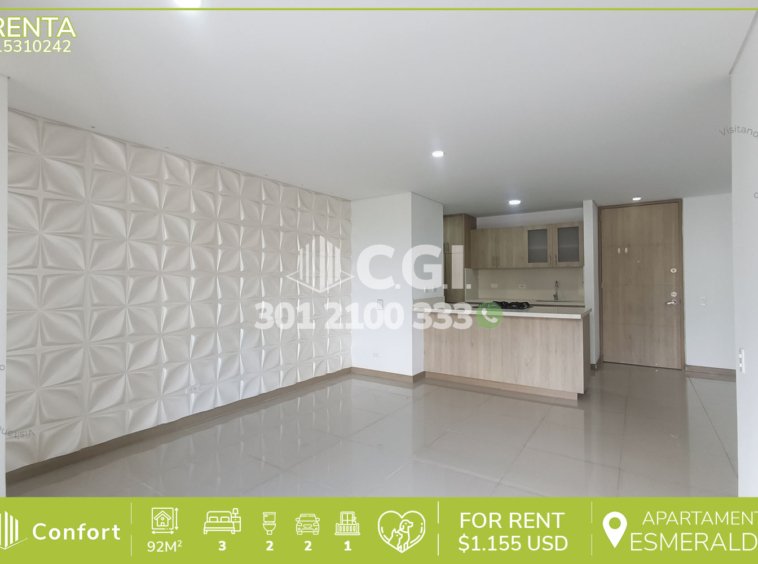 153-10-242 Inmobiliaria en Medellín arrienda apartamento ubicado en excelente sector de El Esmeraldal en Envigado, cuenta con un área de 92mt2 distribuidos en sala comedor espaciosa e iluminada, moderna cocina semi integral, zona de ropas, 3 habitaciones de excelente tamaño, la habitación principal cuenta con vestier y baño privado, adicional podemos encontrar clóset de linos, baño social y amplio balcón con espectacular vista, parqueadero doble lineal y cuarto útil. Ubicado en urbanización con seguridad 24/7 y con zonas de esparcimiento como piscinas, salón social, gimnasio, parque infantil, zona BBQ y zona pet, a su alrededor podemos encontrar supermercado La Vaquita, SmartFit y parque La Guayacana, con vías de acceso por la avenida El Poblado, transversal intermedia y gran variedad de rutas de transporte público. CONFORT GESTORES INMOBILIARIOS – Arriendo en Envigado