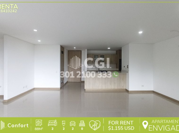 164-10-242 Inmobiliaria en Medellín arrienda apartamento ubicado en excelente sector de El Esmeraldal en Envigado, cuenta con un área de 88mt2 distribuidos en sala comedor espaciosa e iluminada, moderna cocina semi integral, zona de ropas, 2 habitaciones de excelente tamaño, la habitación principal cuenta con vestier y baño privado, adicional podemos encontrar baño social y amplio balcón con espectacular vista, parqueadero doble lineal y cuarto útil. Ubicado en urbanización con seguridad 24/7 y con zonas de esparcimiento como piscinas, salón social, gimnasio, parque infantil, zona BBQ y zona pet, a su alrededor podemos encontrar supermercado La Vaquita, SmartFit y parque La Guayacana, con vías de acceso por la avenida El Poblado, transversal intermedia y gran variedad de rutas de transporte público. CONFORT GESTORES INMOBILIARIOS – Arriendo en Envigado